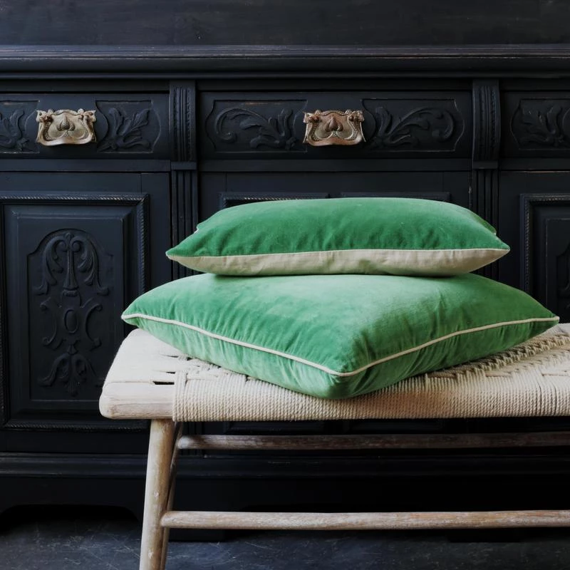 Parrot Green rectangle velvet cushion. These beautiful cotton green velvet cushions with a natural coloured textured reverse come complete with feather inner. Parrot green velvet is a fun, yet sophisticated pop of colour. Inspired by the deep green feathers of a parrot or the deep green of foliage, this cushion will certainly bring the outdoors in when added to your home. A refreshing and happy colour.