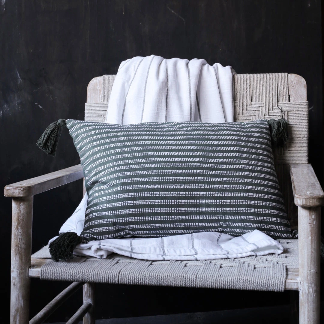 Green printed cushion with tassels.Ā 100% cotton cushion in green with a white printed stitch design to one side and greenĀ tasselsĀ on the corners. Comes complete with feather inner and zip closure on the rear.Ā