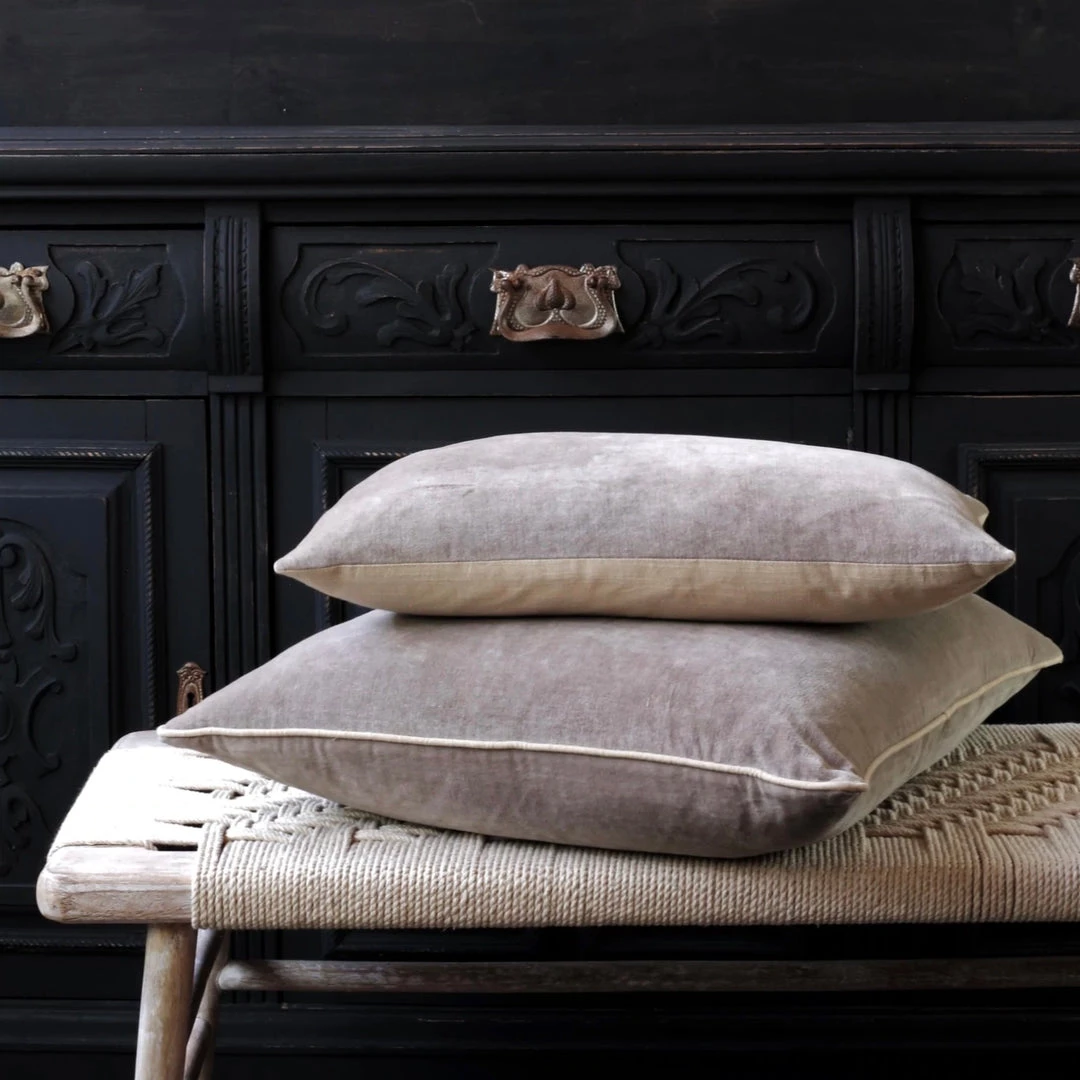 Taupe rectangle velvet cushion. These beautifulĀ cotton neutral velvet cushions with a natural coloured textured reverse come complete with feather inner.Ā The softest shade of Taupe, this is a wonderful neutral colour to mix and match.