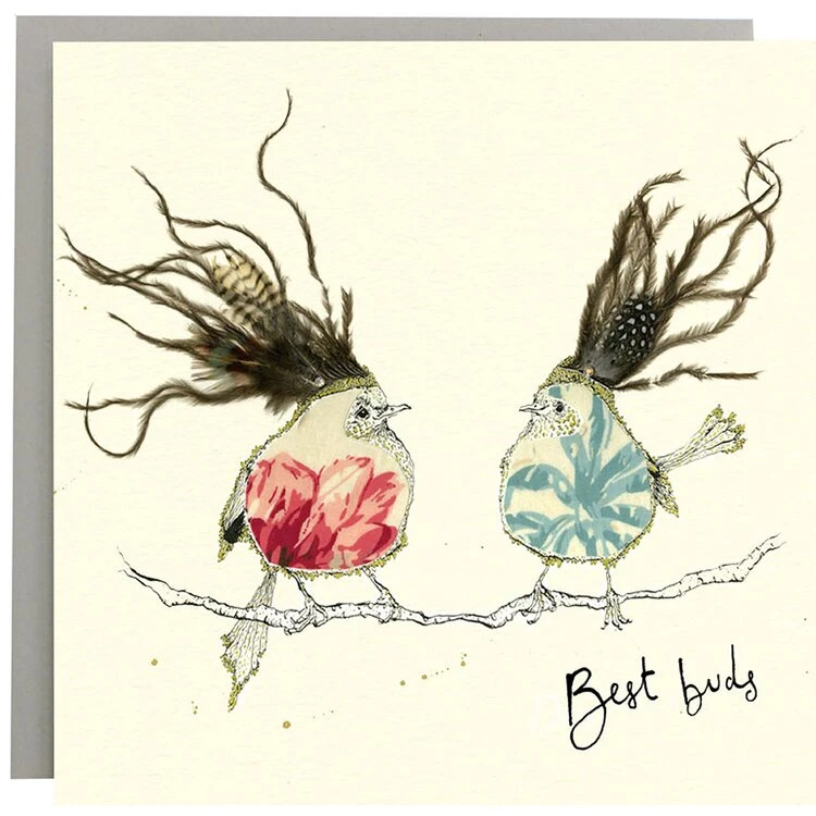 Best Buds Birds Card. A greetings card illustrated with two colourful birds and the handwritten text ‘Best buds’. Left blank inside so that you can write your own message.