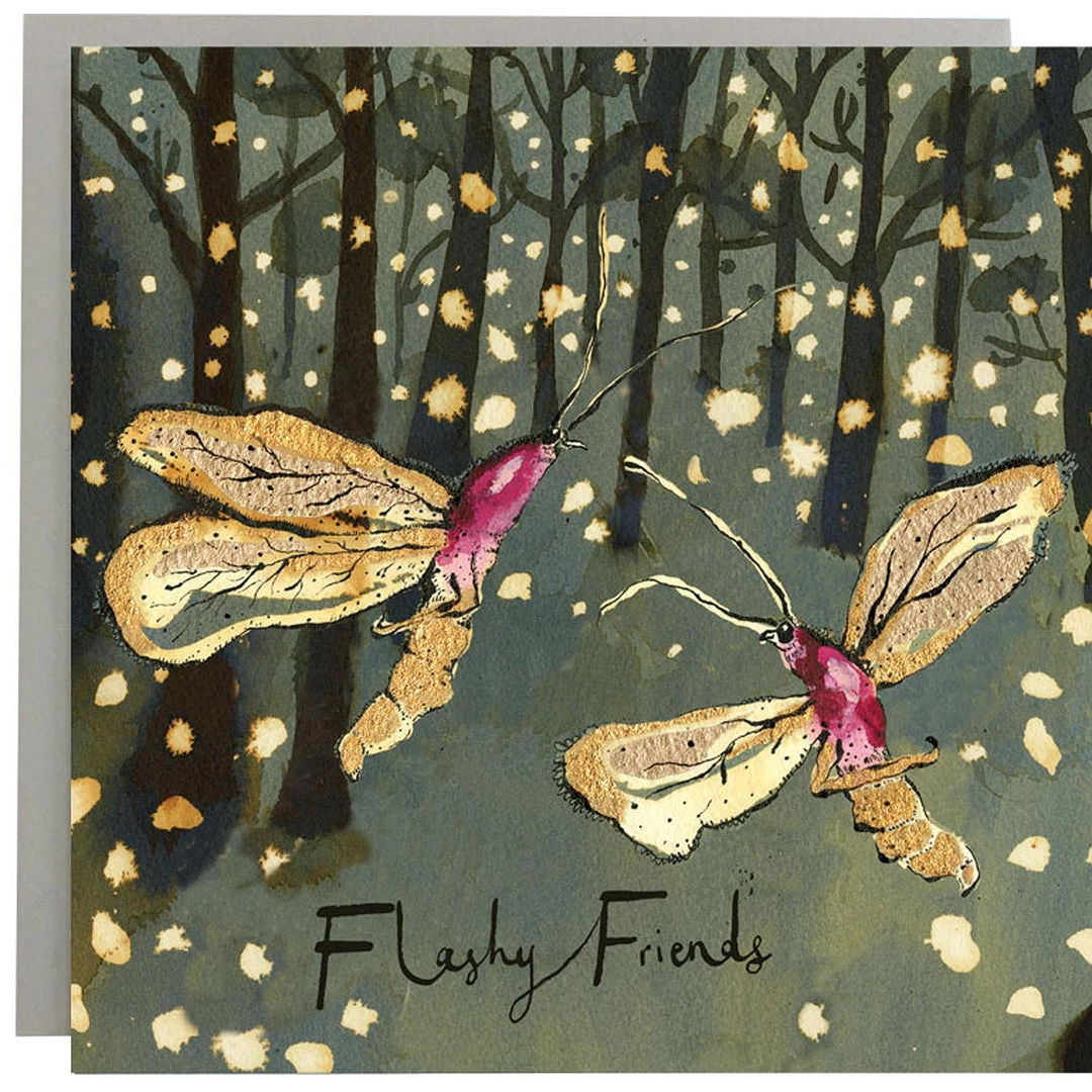 Flashy Friends Fireflies Card. A greetings card illustrated with two glowing Fireflies and the handwritten text ‘Flashy Friends’. Left blank inside so that you can write your own message.