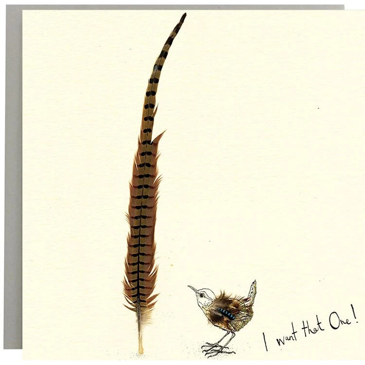 I Want That One. A greetings card illustrated with a tiny bird looking at an extra large feather and the handwritten text ‘I want that one’. Left blank inside so that you can write your own message.