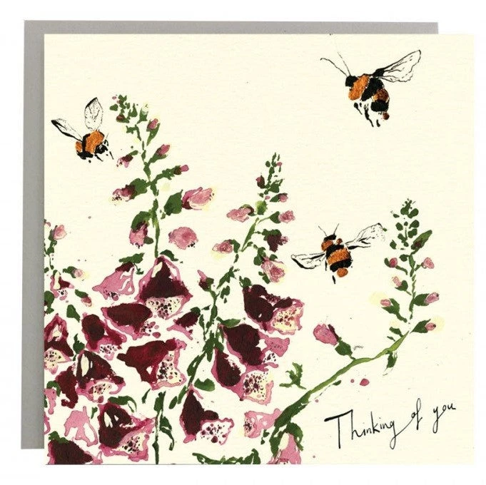 Thinking of You Card. A greetings card illustrated with foxgloves and a Bumble Bee and the handwritten text ‘Thinking of you. Left blank inside so that you can write your own message.