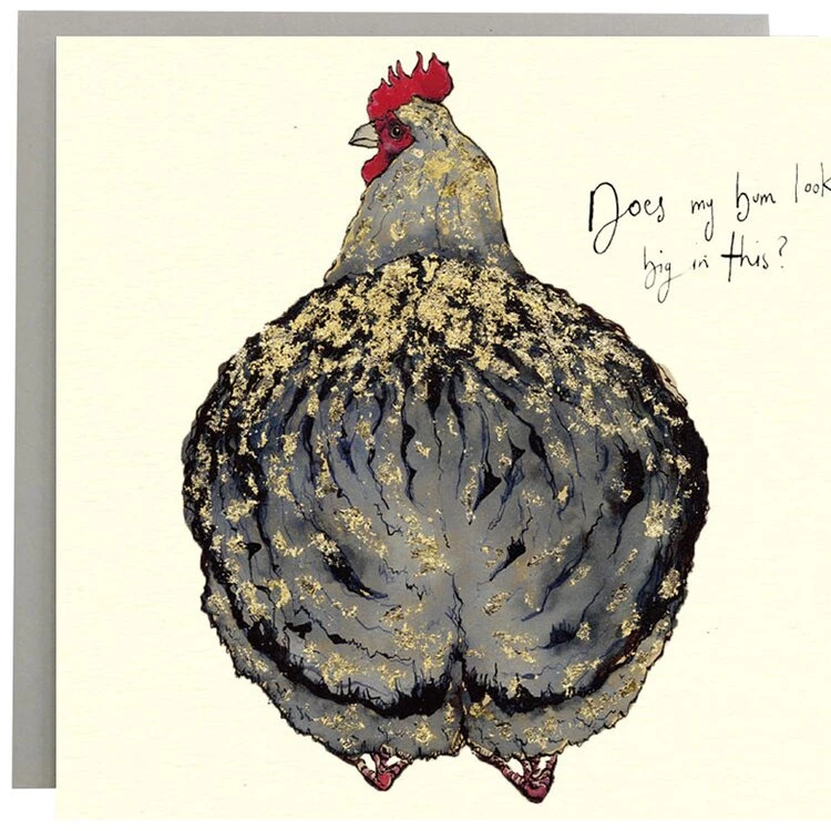 Does my bum look big Greetings Card. A greetings card illustrated with a big bottomed Chicken and the handwritten text ‘Does my bum look big in this?. Left blank inside so that you can write your own message.
