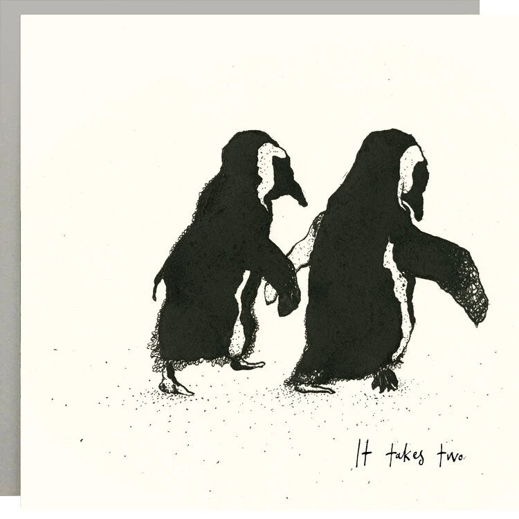 It Takes Two Card. A card illustrated with two penguins holding flippers and the handwritten text ‘It takes two’. Left blank inside so that you can write your own message.