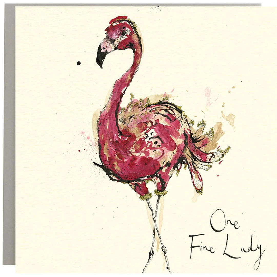 One Fine Lady Card. A greetings card illustrated with an elegant pink flamingo and the handwritten text ‘One Fine Lady’. Left blank inside so that you can write your own message.