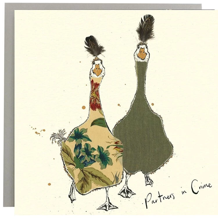 Partners in Crime Card. A greetings card illustrated with two smiling Geese and the handwritten text ‘Partners in Crime’. Left blank inside so that you can write your own message.