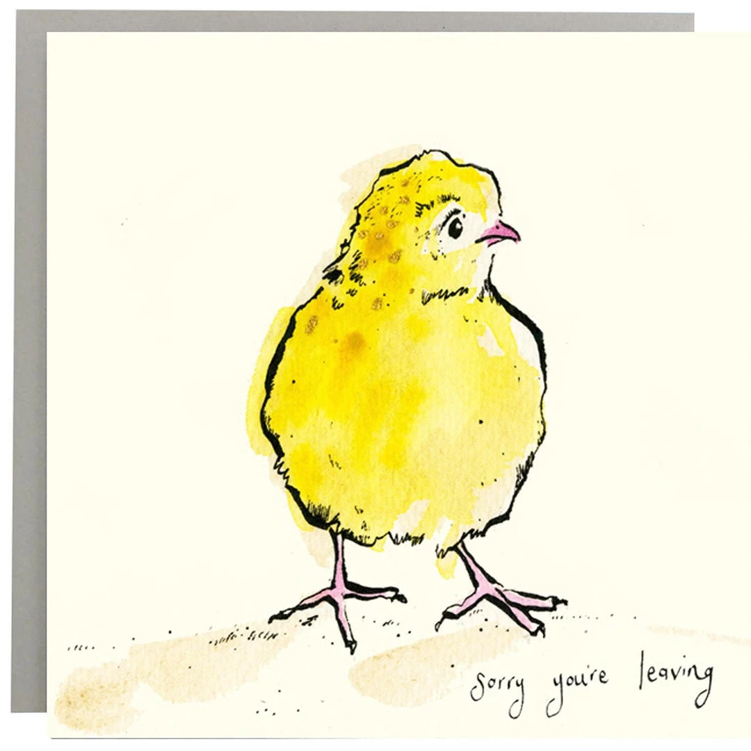 Sorry You’re Leaving Card. A greetings card illustrated with a sorry looking yellow chick and the handwritten text âsorry youâre leavingâ. Left blank inside so that you can write your own message.