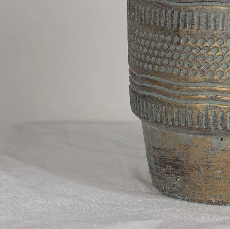 Brushed Gold Planter. This rustic plant pot is crafted from sage green stoneware with a decorative brushed gold finish. Use to hold bits and bobs or pop in a plant.