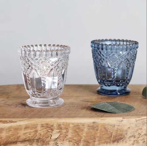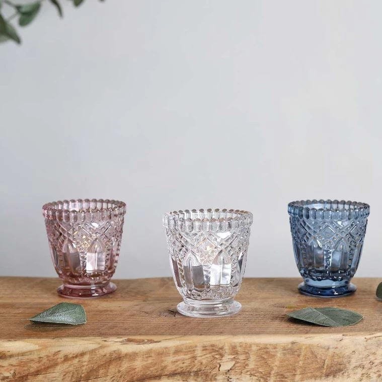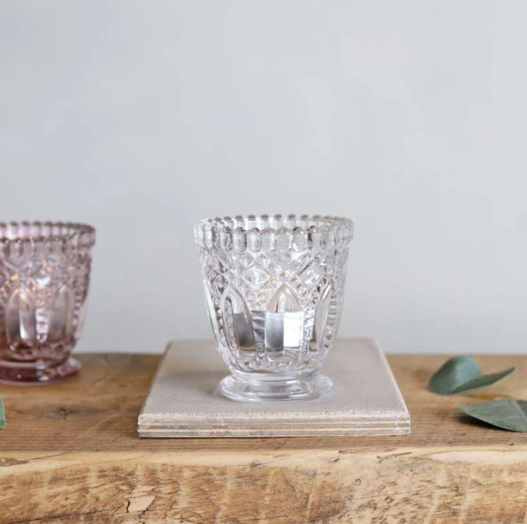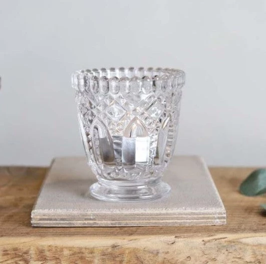 Pressed, clear glass votive. This decorative, clear, tealight holder with circle design is crafted from glass and can be used all around the home. Create an interesting tablescape with height, depth and colour and sparkle.