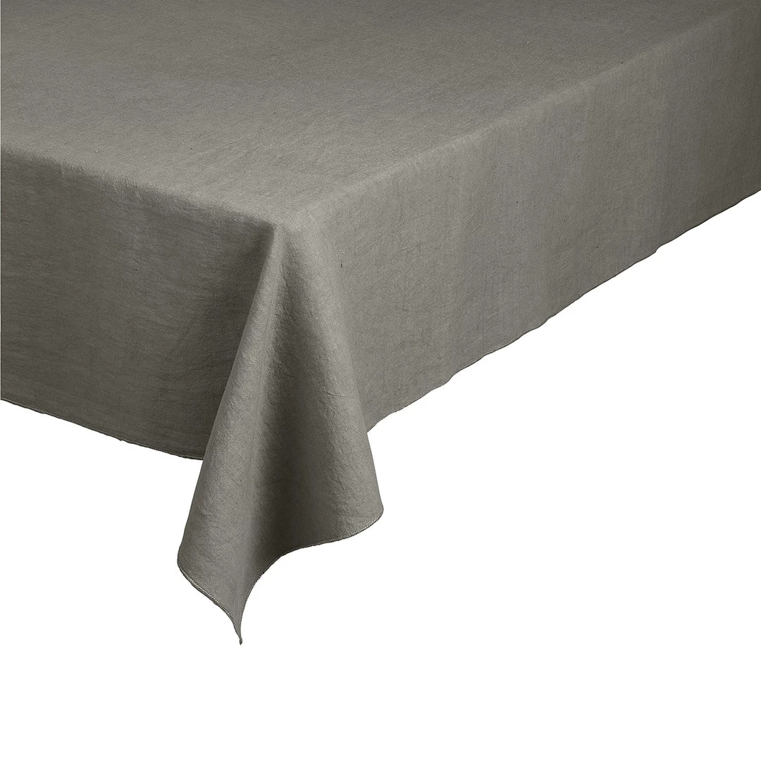 Luxurious linen tablecloth in agave green. This beautiful tablecloth turns any mealtime into a special occasion. Woven from soft, premium quality linen, this tablecloth drapes elegantly. This durable yet pleasantly soft linen fabric in a natural olive green has a subtle crushed texture, which gives it an organic, attractive, classic look.