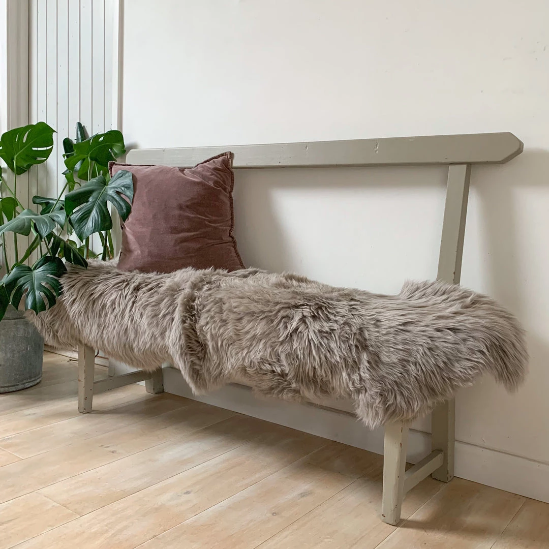 Midi Sheepie in Vole. Similar to our bestselling double sheepies but not as long at 160cm – 165cm (rather than 185cm). Beautiful, tactile and versatile, our sheepskins look and feel wonderful draped over a sofa, bed or bench, or on the floor. The midi sheepskins are crafted from two single sheepskins sewn together to create a long length.