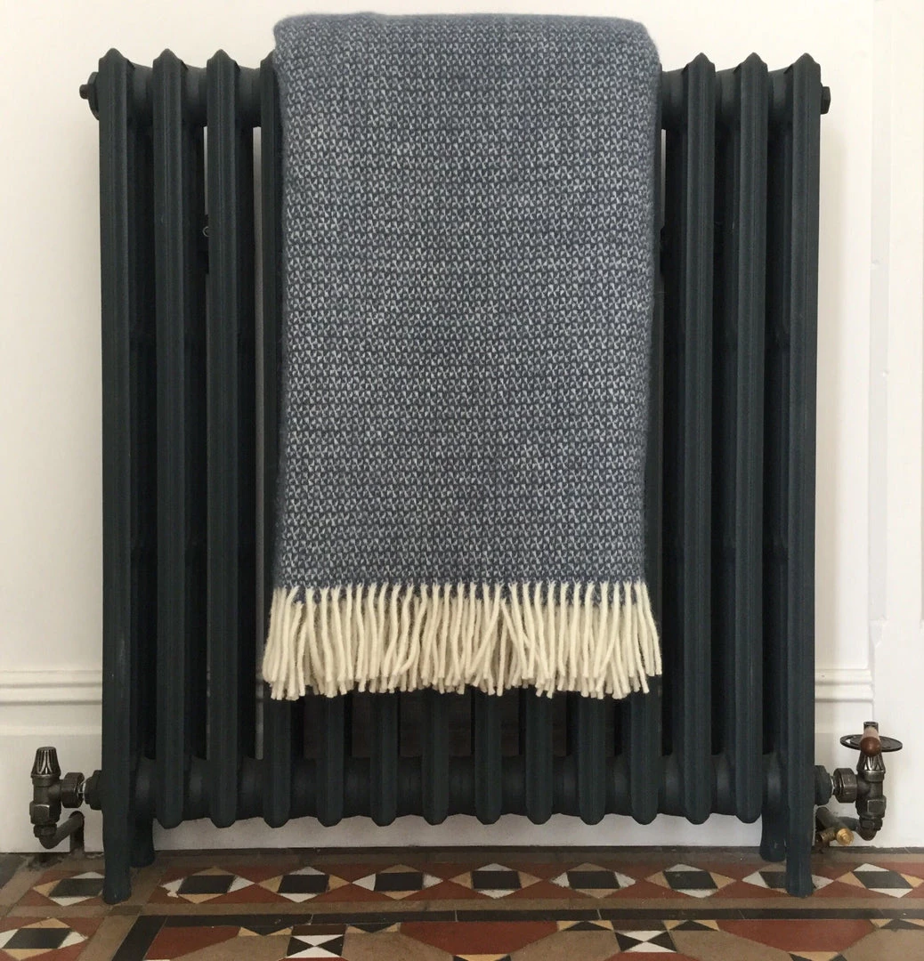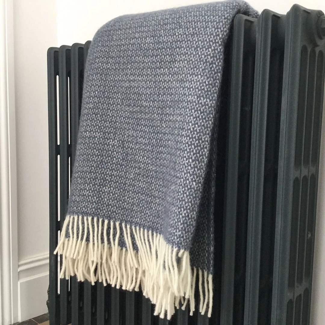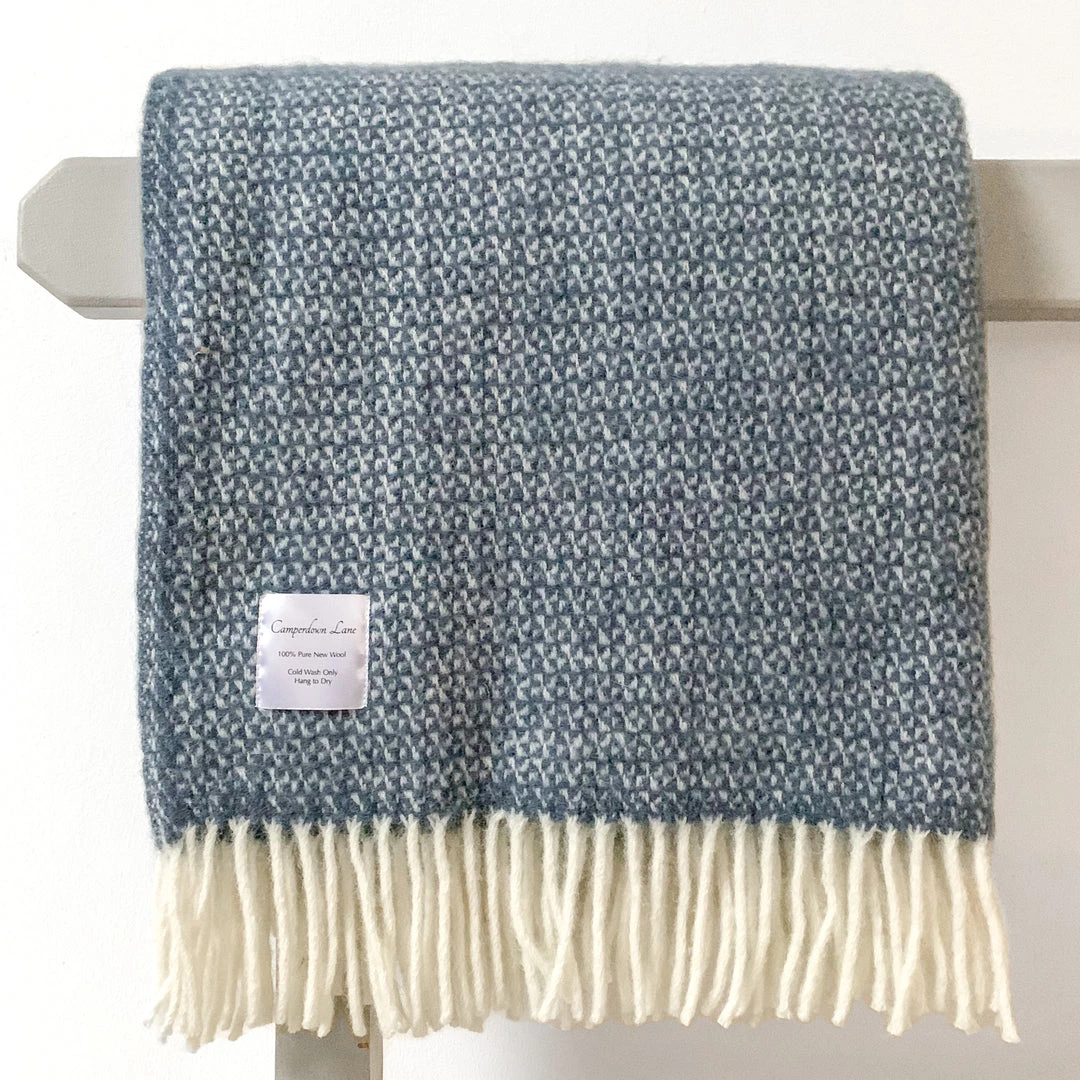 Camperdown LaneĀ pure new wool throw in a blue slateĀ design with ivory fringing. Add colour and texture to a chair, sofa or bed, or take out for a picnic.
