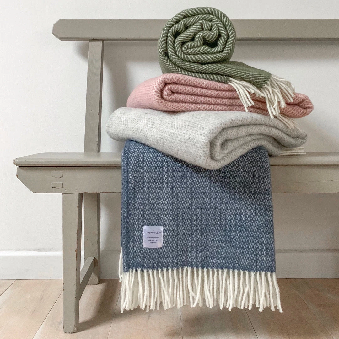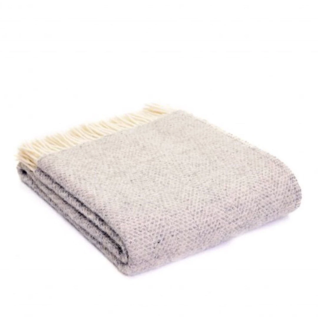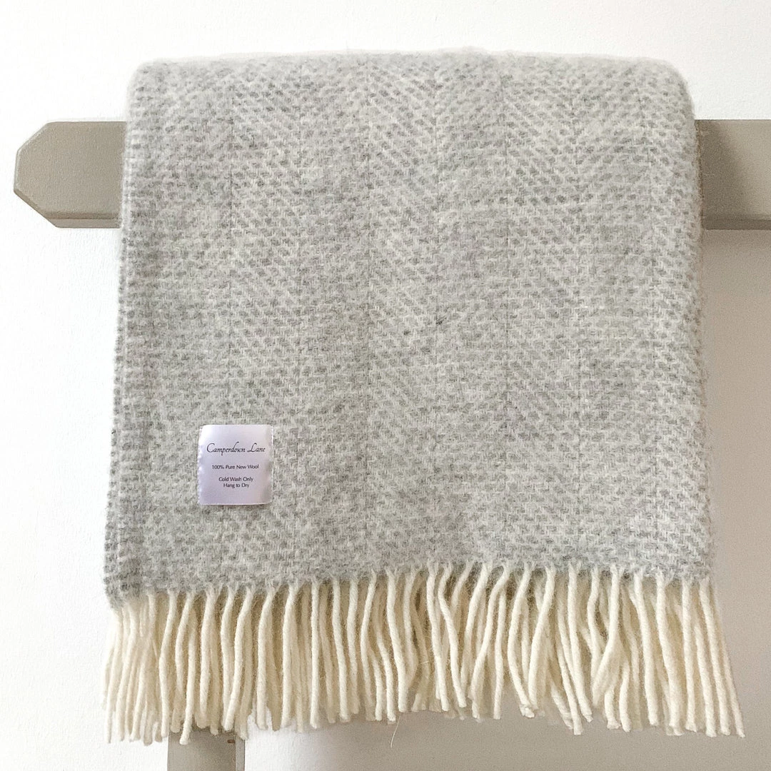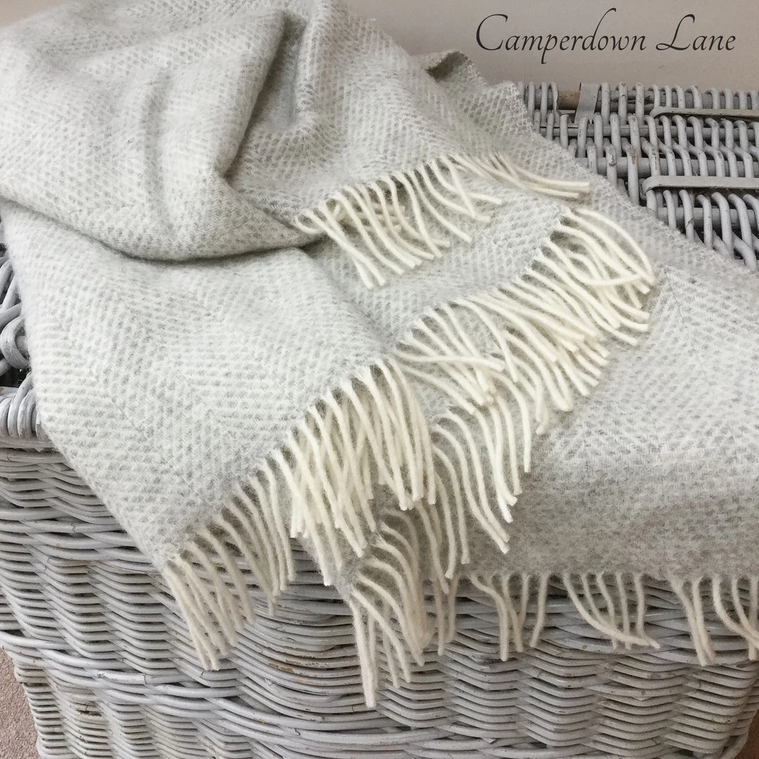 Camperdown Lane pure wool throw. This pure new wool throw features a beehive design in soft grey and cream with cream fringing.