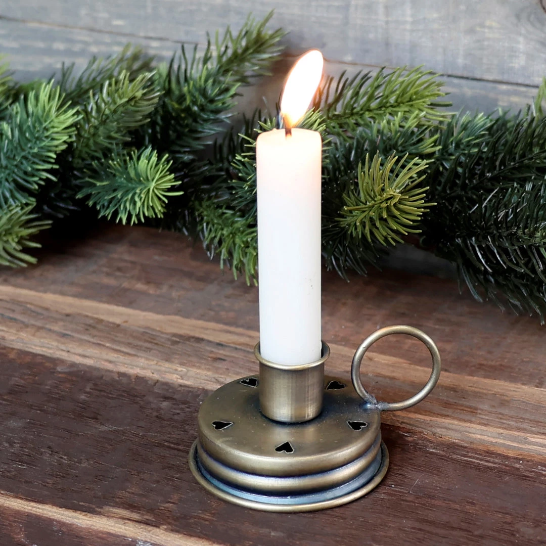 Antique brass heart chamberstick. This traditional style chamberstick crafted from antique brass coloured metal with little cutout hearts is a lovely way to display your candles and makes a thoughtful gift. Takes candles of 2cm in diameter (not included).