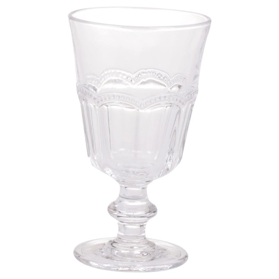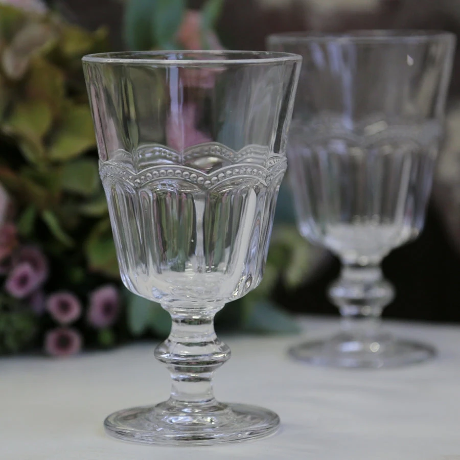 Wine Glass with Beaded Design. This pretty stem glass is adorned with a lovely beaded design. This glass is attractive, yet weighty and works well for wine or water.