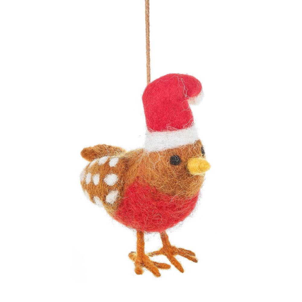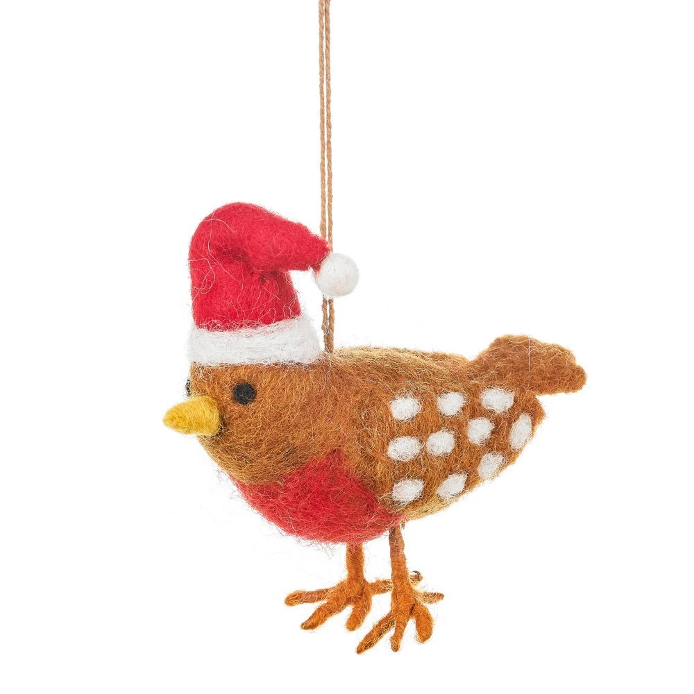 Fairtrade felt Chicken Christmas Decoration. This Chicken is feeling the festive spirit. With adjustable wire legs and feet with a needle felted body and of course, a needle felted Santa hat perched on top of his head.