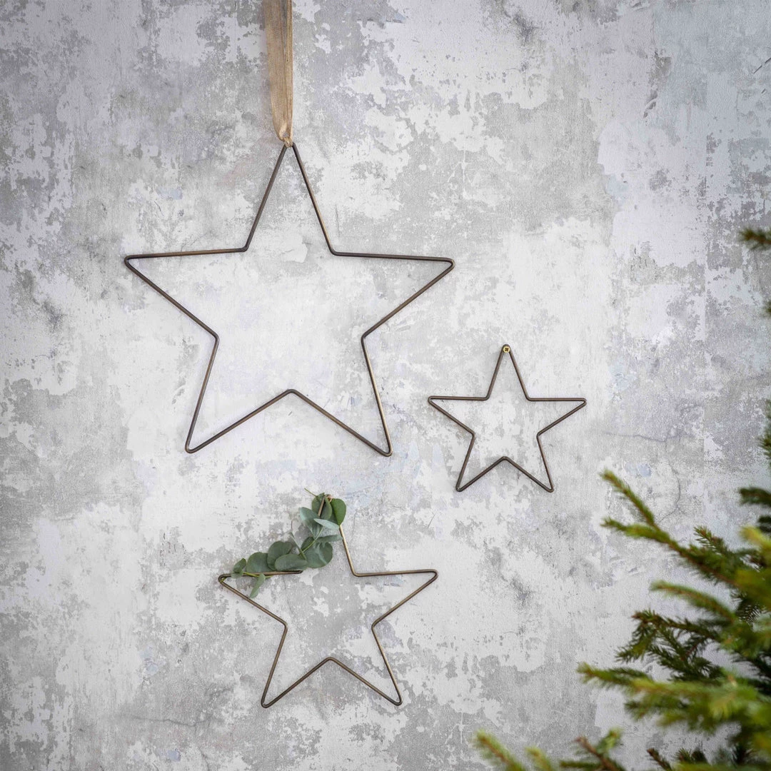 Metal star with antique brass finish. Leave plain or wrap with flowers, leaves or fairy lights. Make them work for your style. Can be hung or propped up.