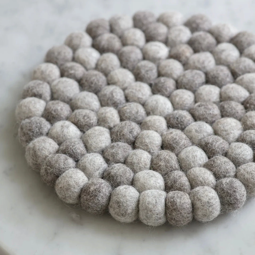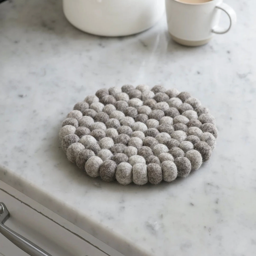 Chunky Felt Trivet. We love how handmade items add character to a home. This circular bobbled trivet is made from Fairtrade Felt in shades of grey. It’s brilliantly heat-resistant making it the ideal addition to the kitchen.