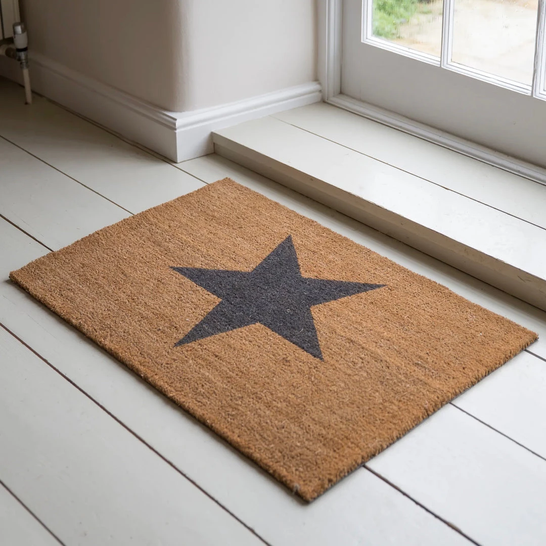 Large star doormat in natural with single charcoal star. Every entrance hall, back or front door should be dressed with the star quality it deserves. Our Star Doormat is ideal for ensuring no mud touches your carpet. It’s durable, robust and offers plenty of space for a family full of shoes which need cleaning!