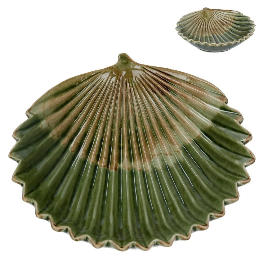 Ceramic Leaf Dish. Earthenware fan leaf dish in an antiqued green and ochre. Perfect for displaying knick-knacks and trinkets, key storage, make-up, jewellery or soaps, or for serving nibbles to guests.