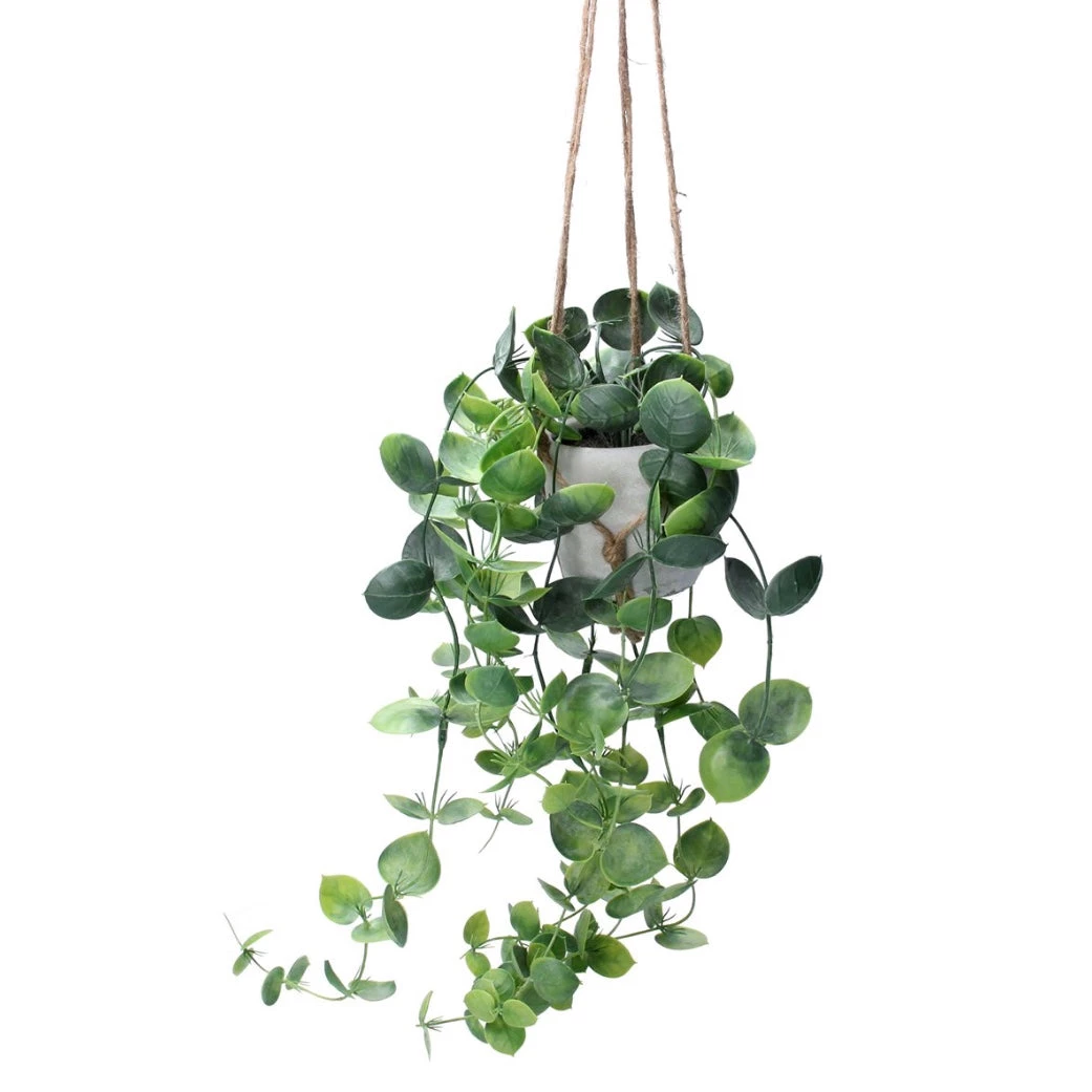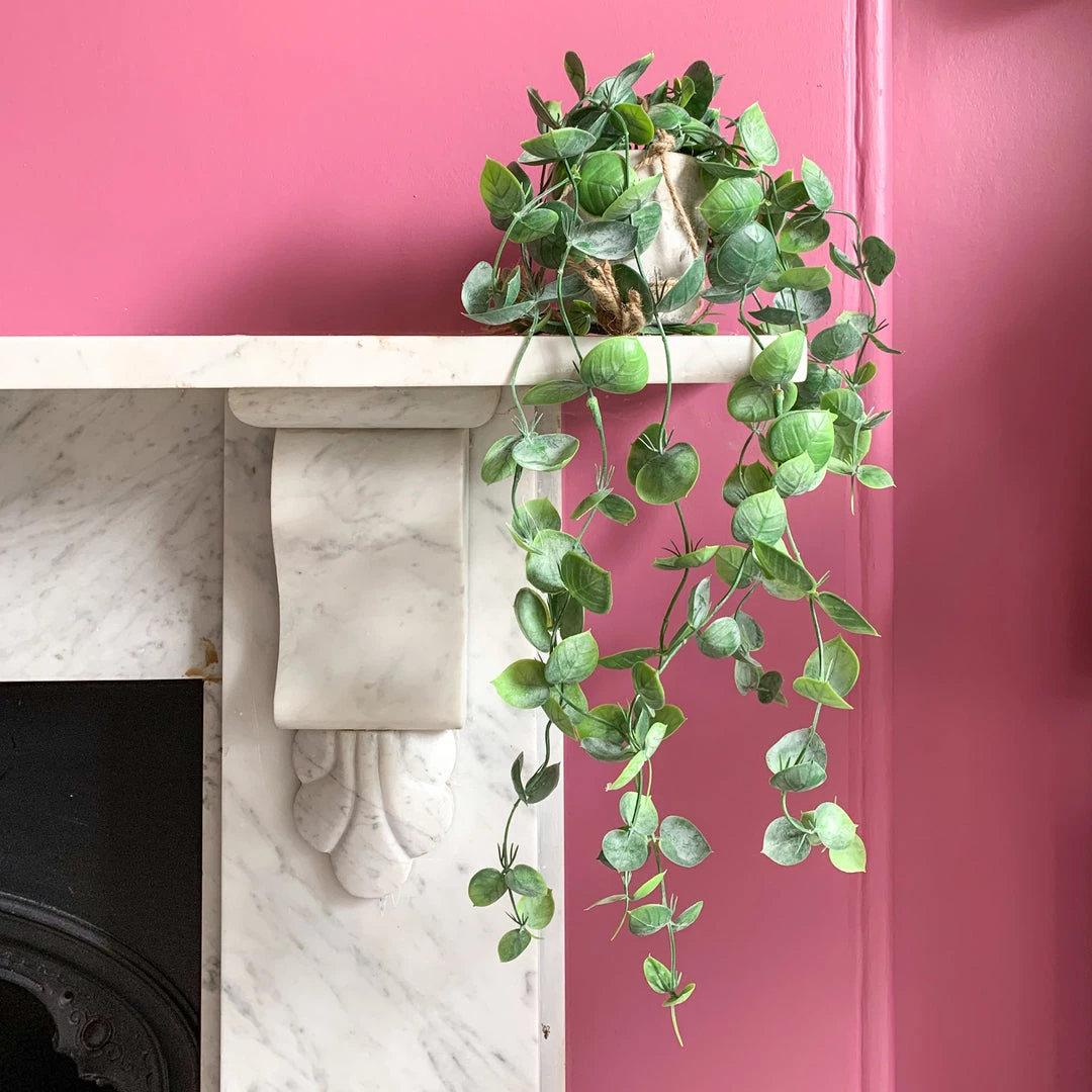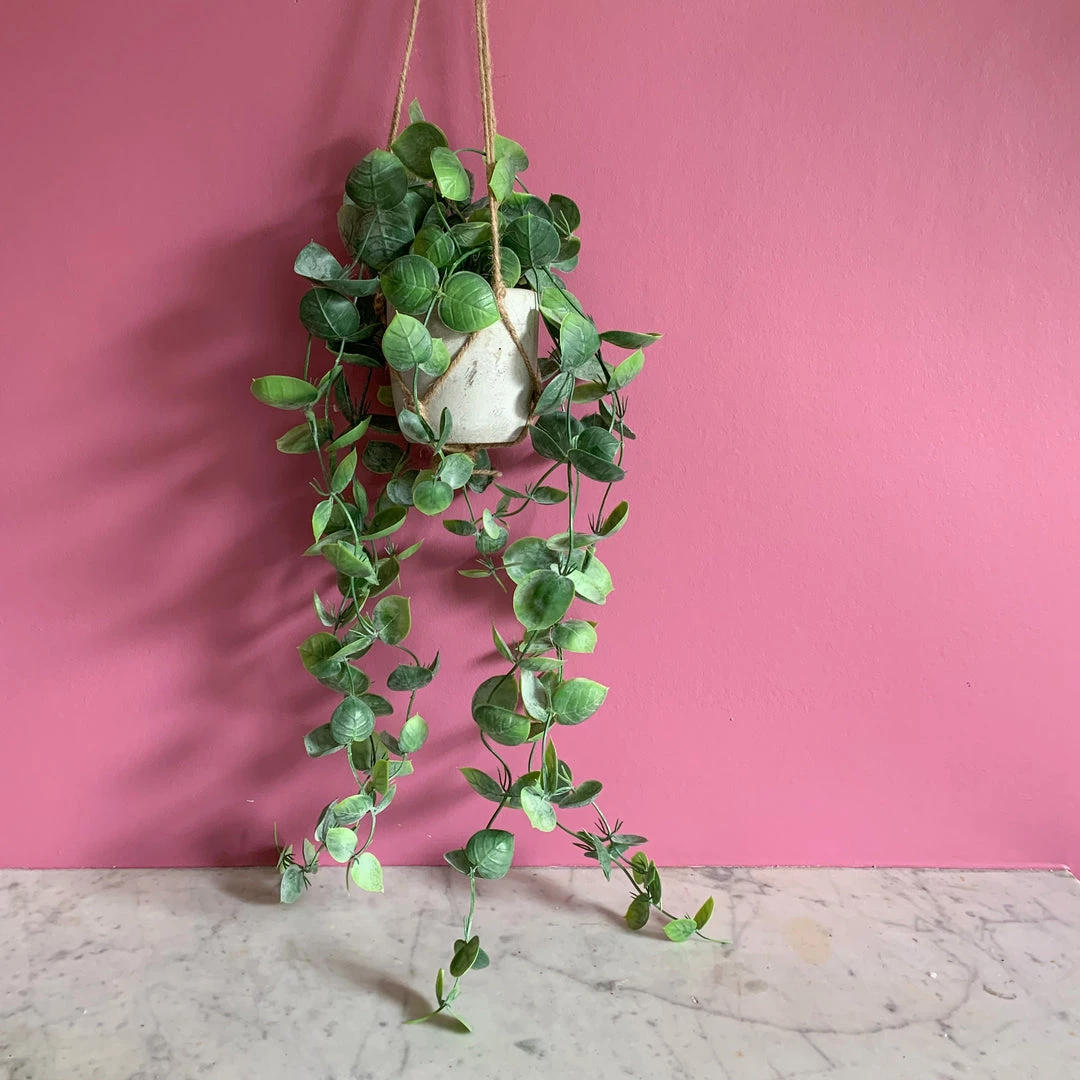 Trailing faux Hova’s plant in a grey cement pot. This very realistic looking artificial plant looks great on a shelf or on top of a cupboard with the strings dangling down. Perfect for the less green-fingered of us.