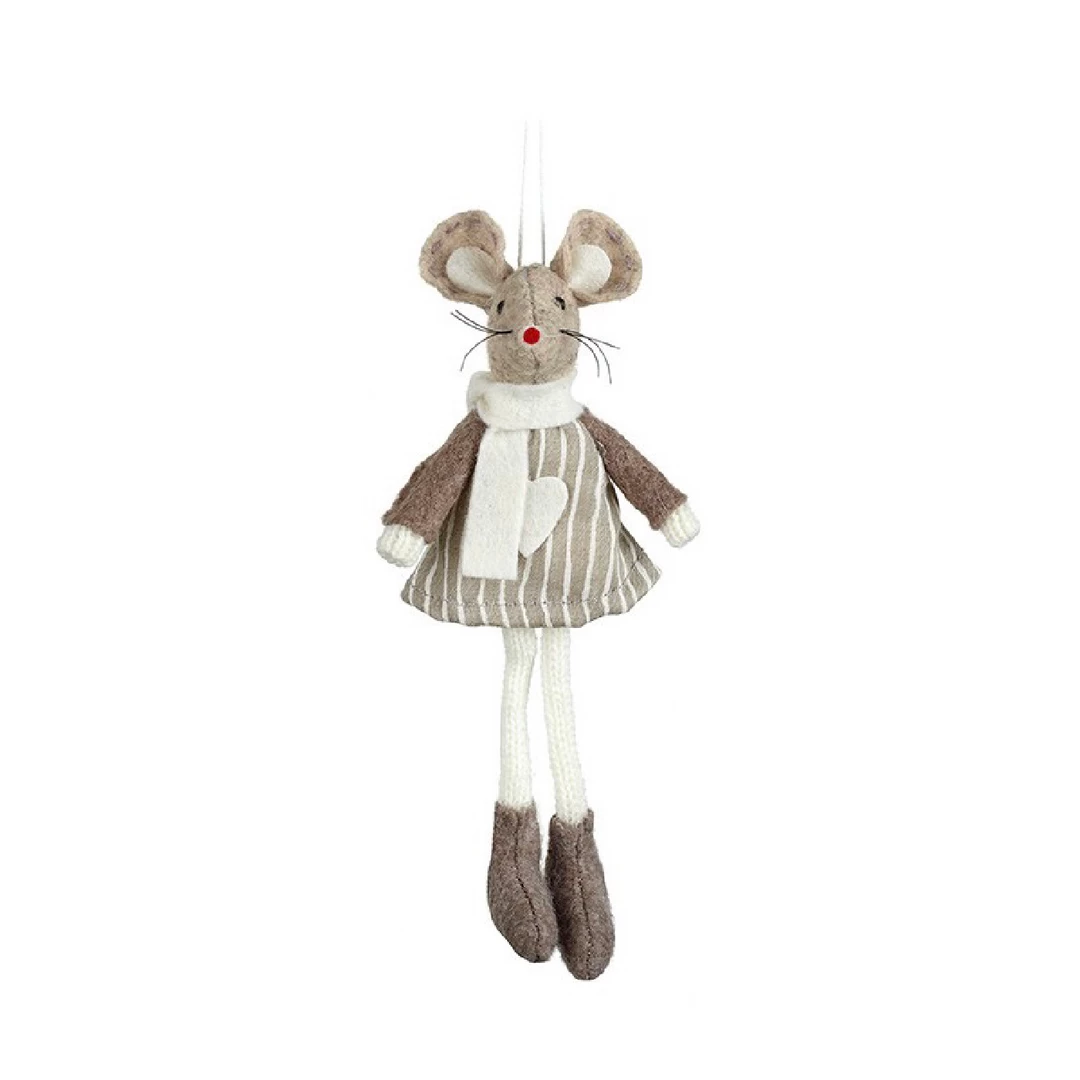 Brown Mouse Decoration. A sweet little felt mouse with a brown striped dress. This leggy lady can sit on a shelf with her legs dangling down or be hung on a hook, knob or tree by the cotton hanging loop.