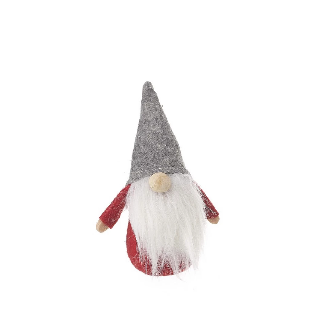 Small red felt gonk decoration with grey hat. This cute little chap makes a lovely addition to a Christmas scheme. Place on a shelf or Christmas tray display and watch how he makes everyone smile.