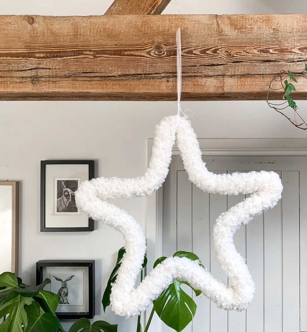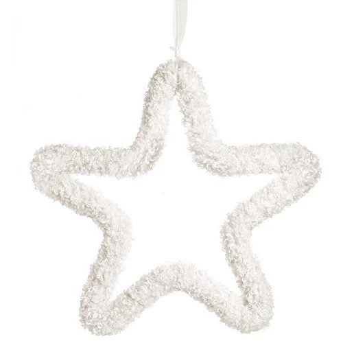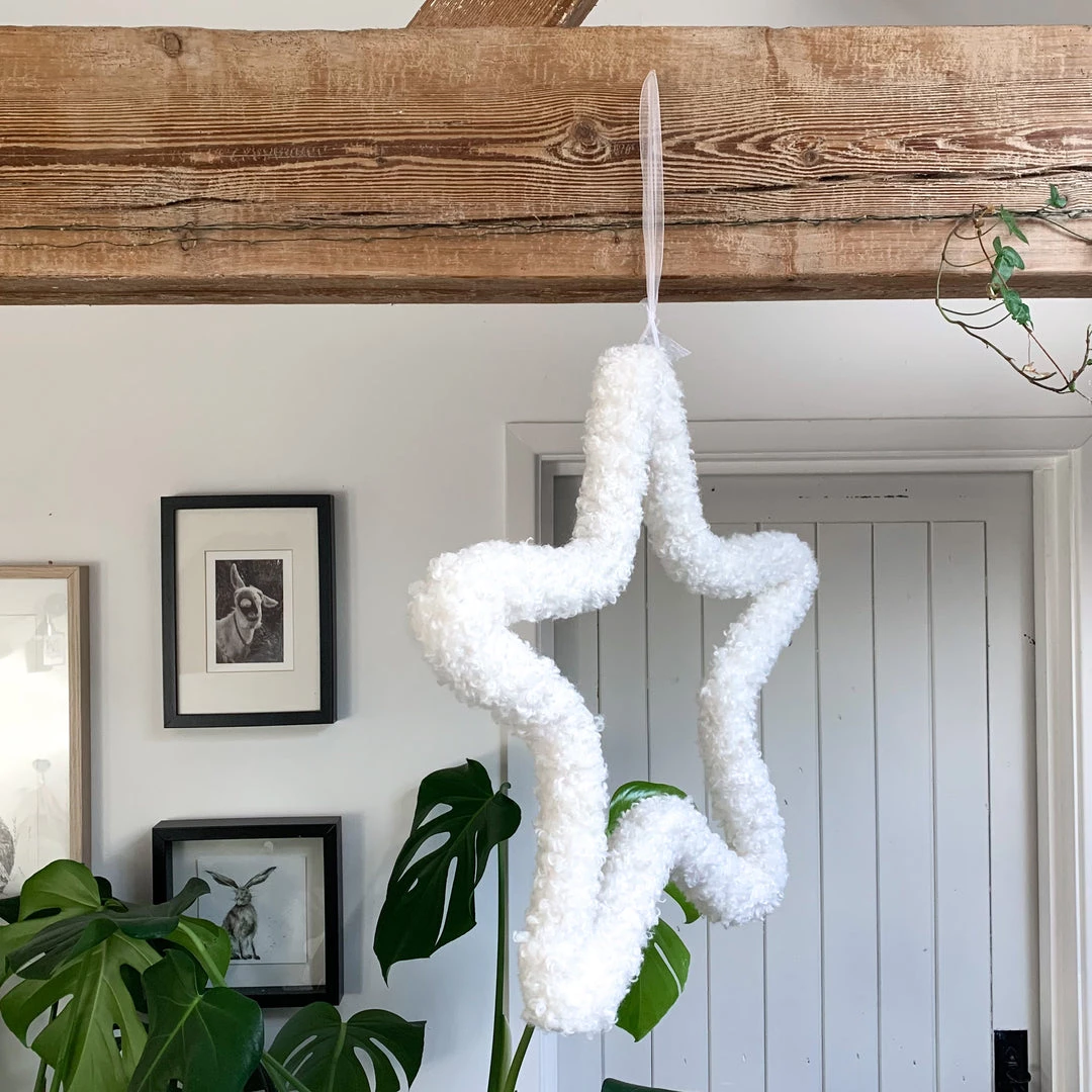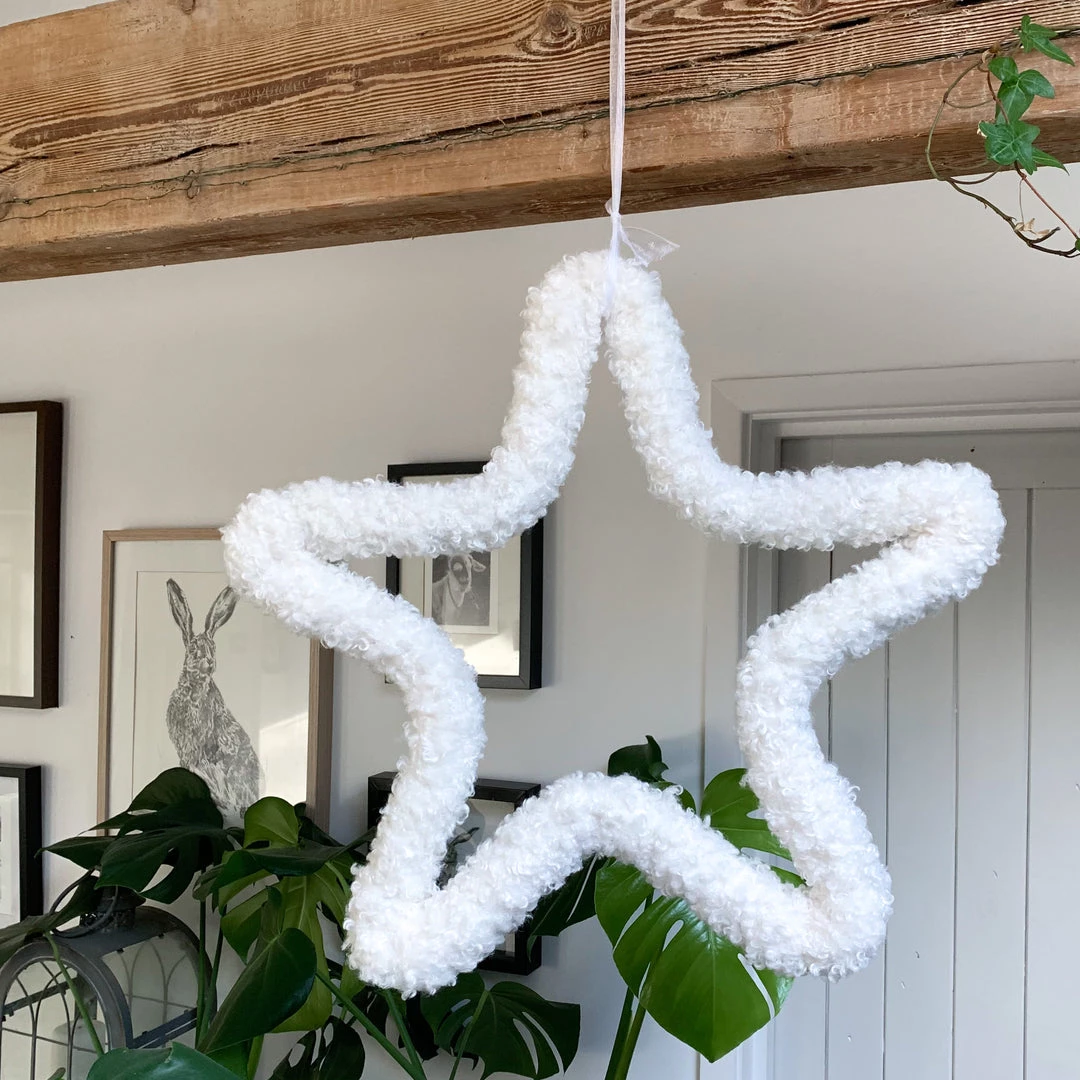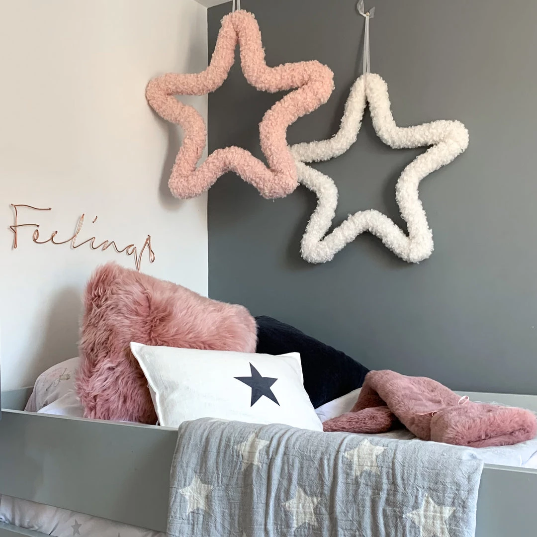 Fleecy star decoration in white. This soft, star decoration is crafted from faux fleece and makes a great addition to a child’s bedroom.