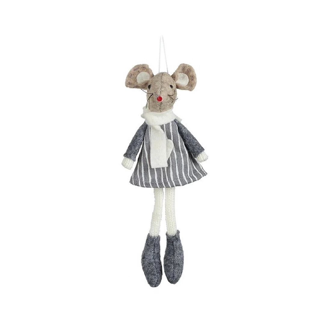 Grey Mouse Decoration. A sweet little felt mouse with a grey striped dress. This leggy lady can sit on a shelf with her legs dangling down or be hung on a hook, knob or tree by the cotton hanging loop.