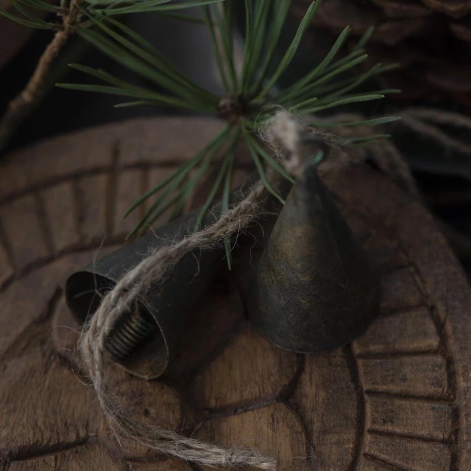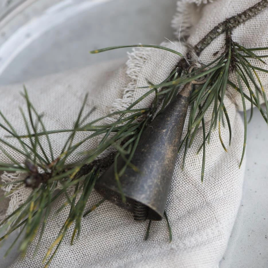 Antiqued Metal Bell Decoration. A beautifully simple, vintage style metal bell decoration which can be hung on a tree, tied together as a cluster or used to adorn place settings on your festive table. Comes with Jute hanging loop.
