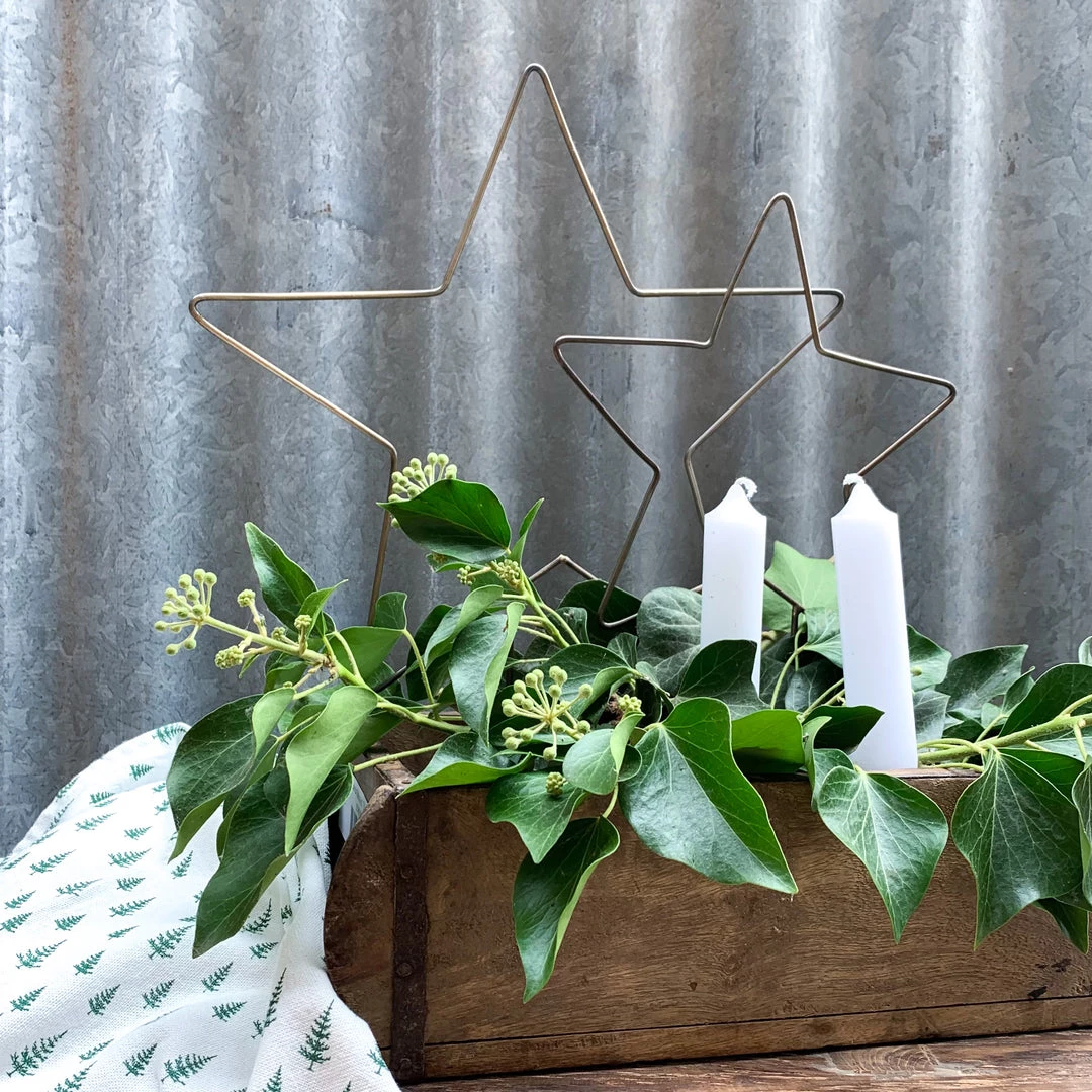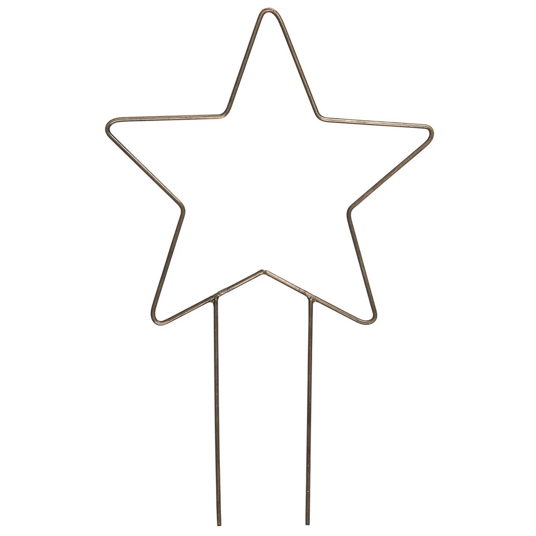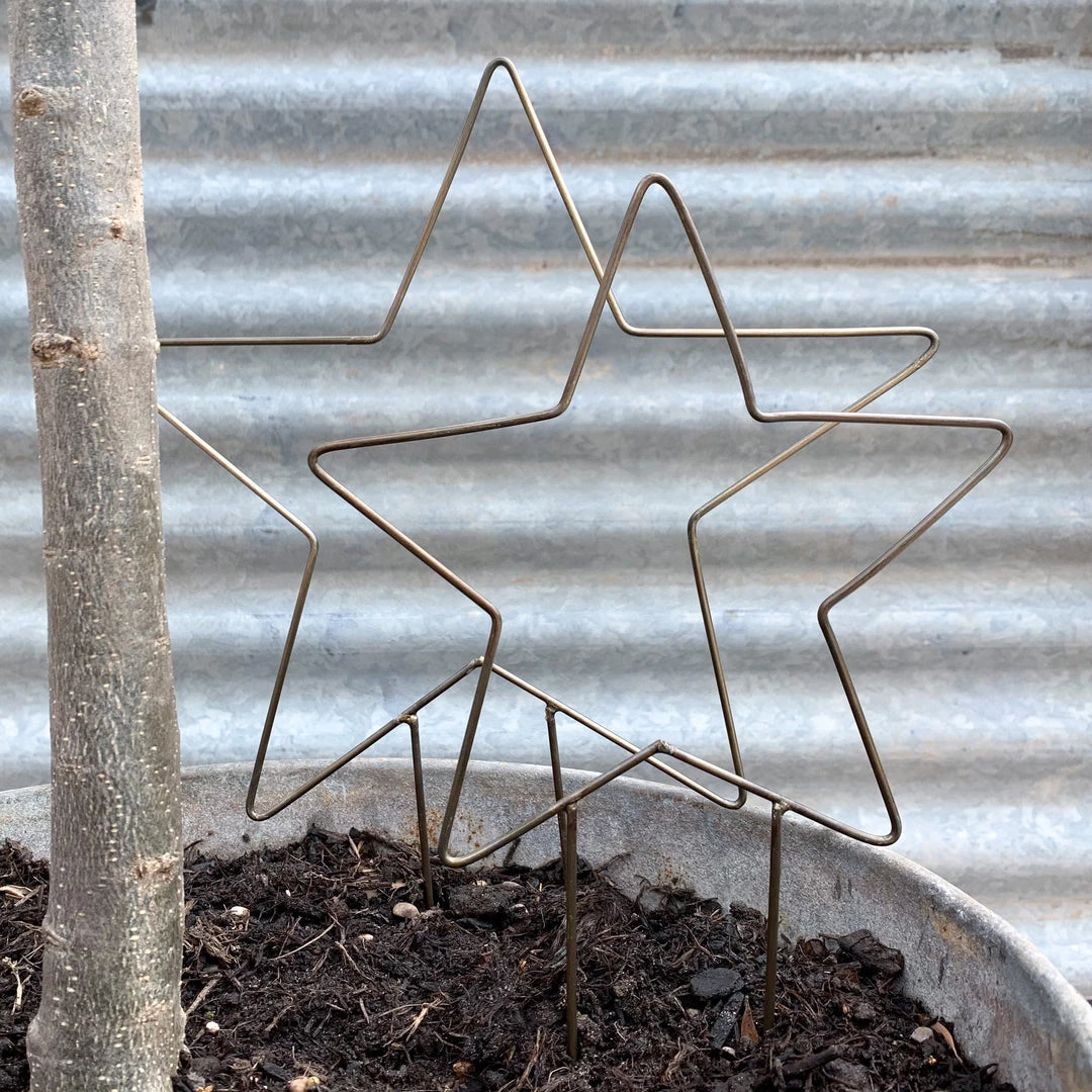 Metal star pot decoration. This simple, rustic, Nordic inspired star decoration with an aged brass finish brings some festive style to your pots. Tuck into a plant pot, flower bed, trough or flower display.