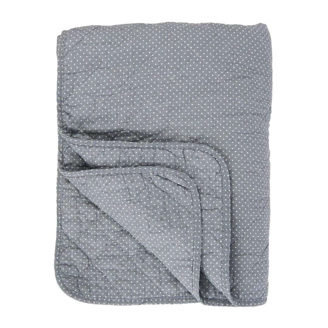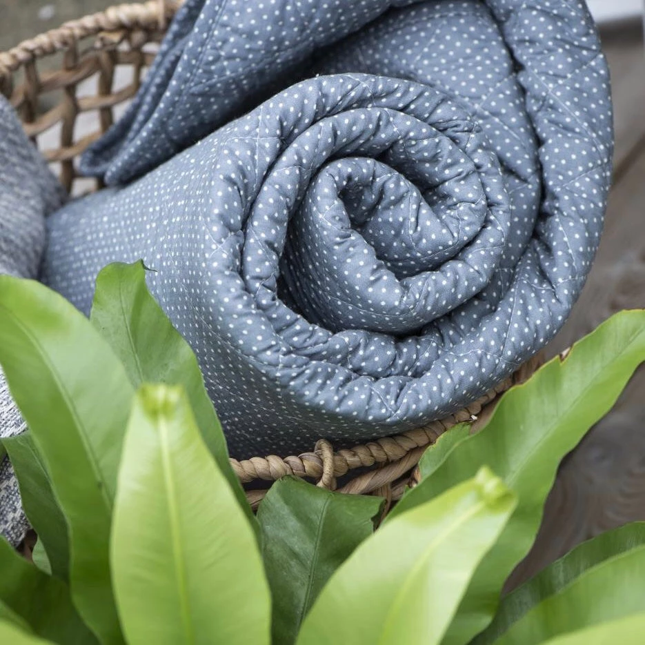 Dusty blue coloured quilt with little white dots. Beautiful on a bed, lightweight enough to use as a comfy picnic rug.