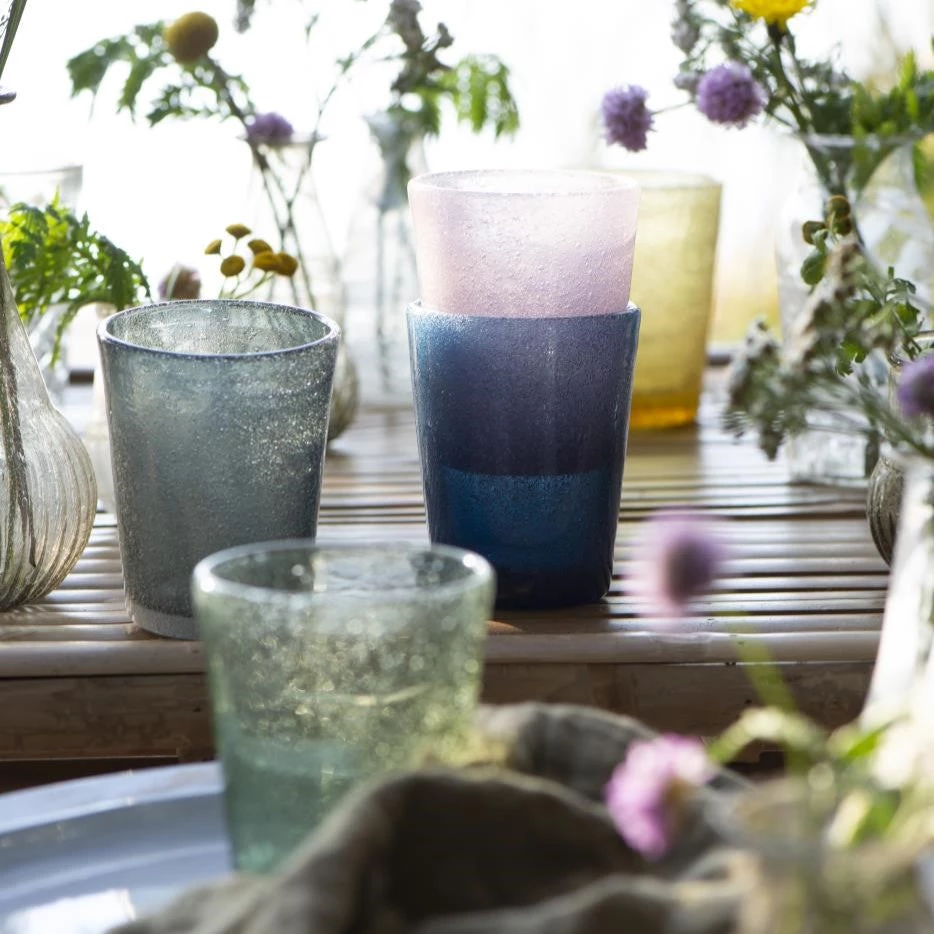 Handblown bubble glass in blue. A lovely, handcrafted glass with a bubbly texture within the glass. Due to the handmade nature of these tumblers, variations in colour and texture will occur as an intrinsic part of the design, giving them a beautiful, unique appeal. Also available in four other colours so you can mix and match.