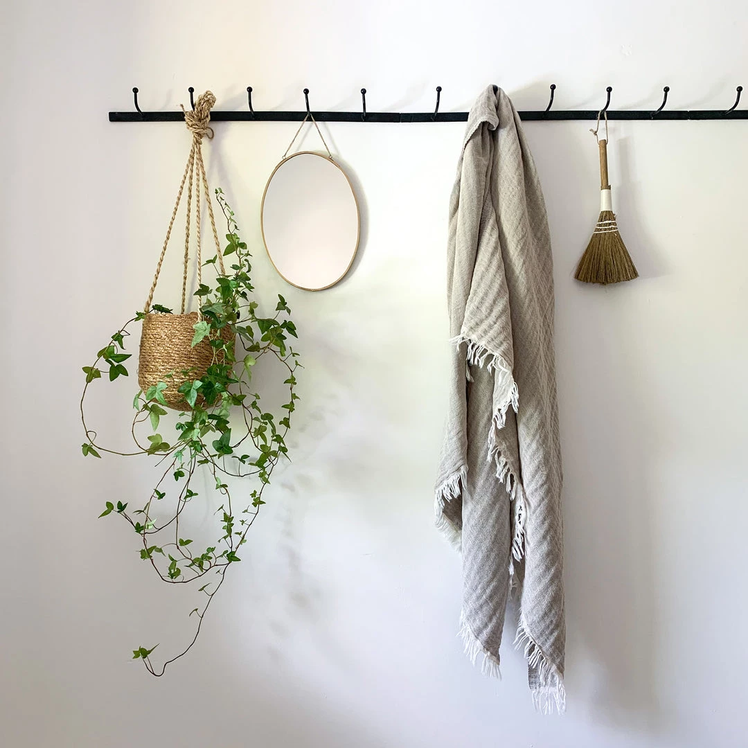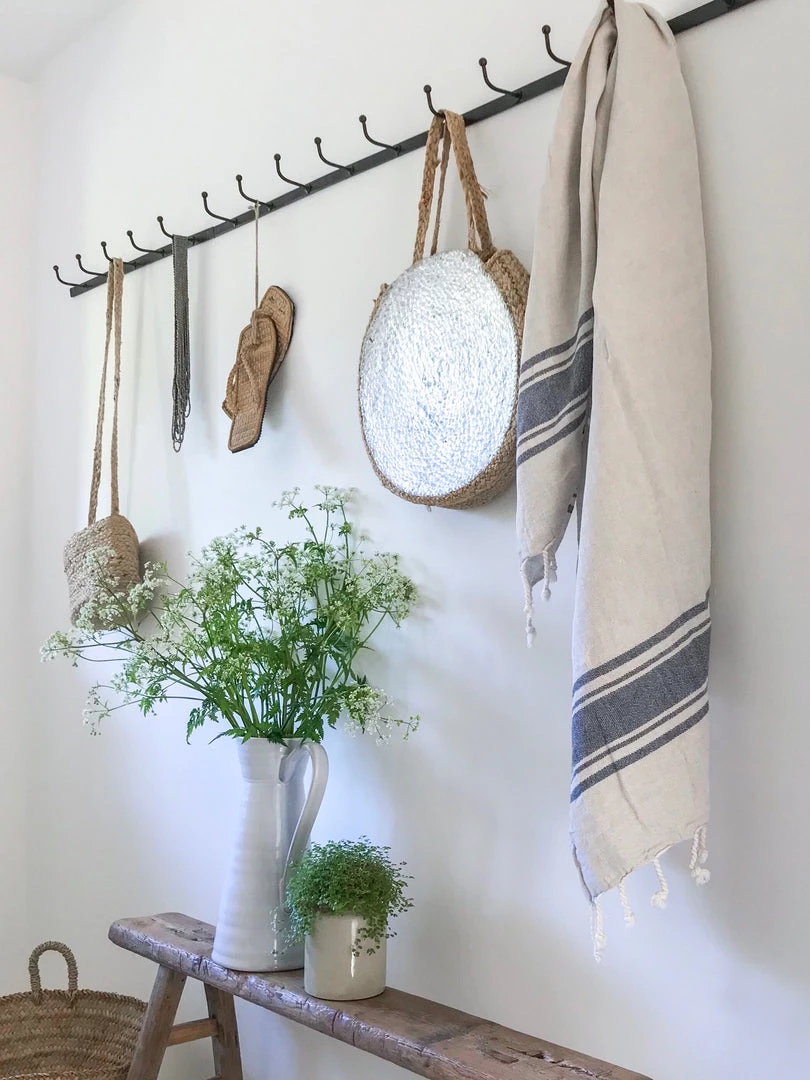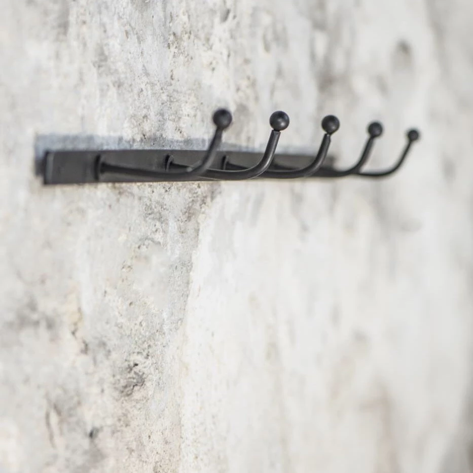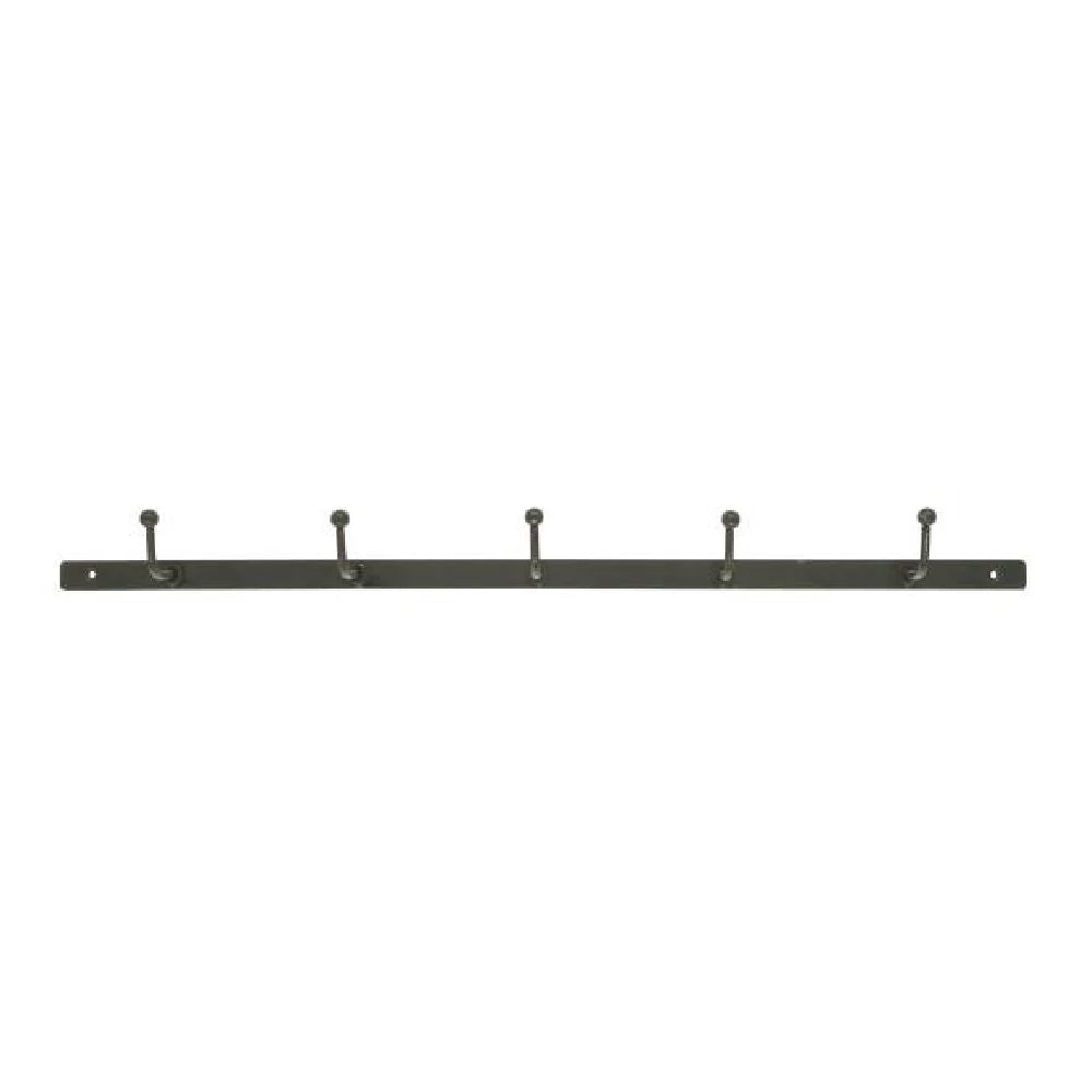 Black metal hook rail with five hooks. A great, industrial style storage solution. Use as a single rail or line a few sets up for a longer row of hooks.