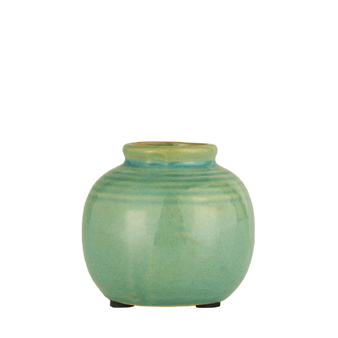 Mini ceramic vase in sea green. This lovely little pot has a grooved design around the neck and a crackle glaze. A lovely addition to a tablescape when used as a bud vase, or place on a shelf for a pop of colour.