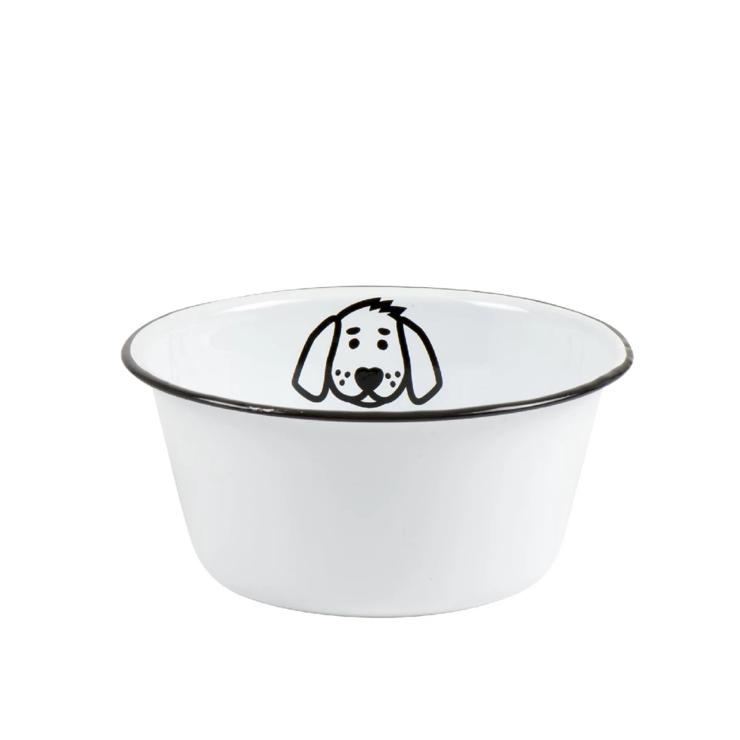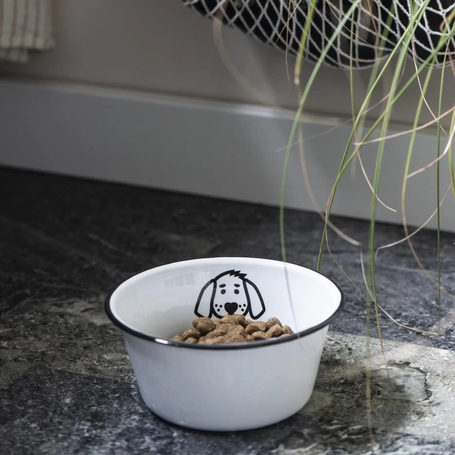 Small, white enamel dog bowl with black rim and black dog face design. Treat your pooch with this stylish bowl. Ideal for feeding smaller dogs.