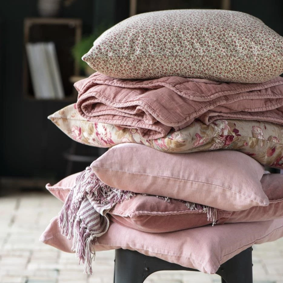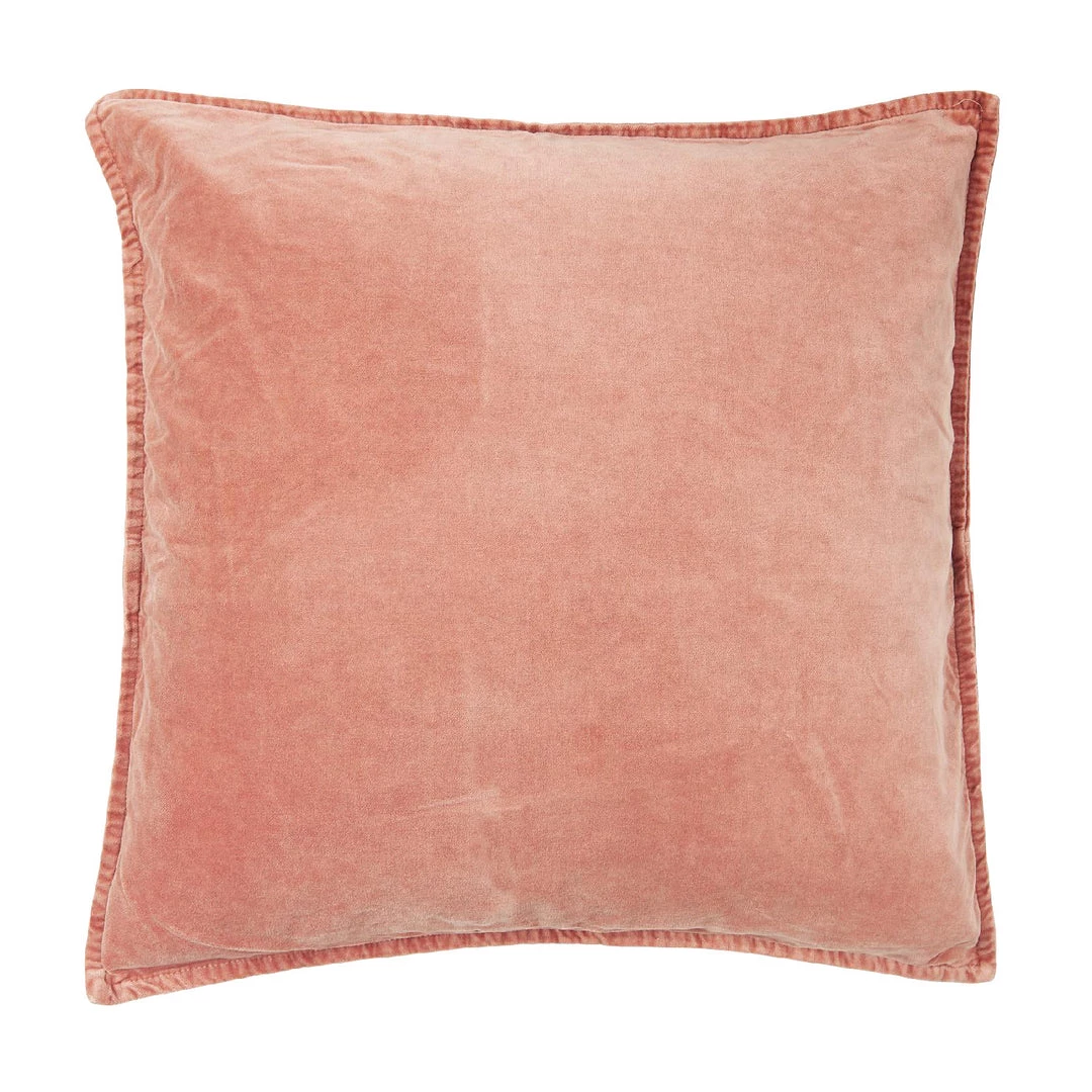 Large square velvet cushion with feather inner in a pale coral pink colour. This cushion is soft and luxurious.