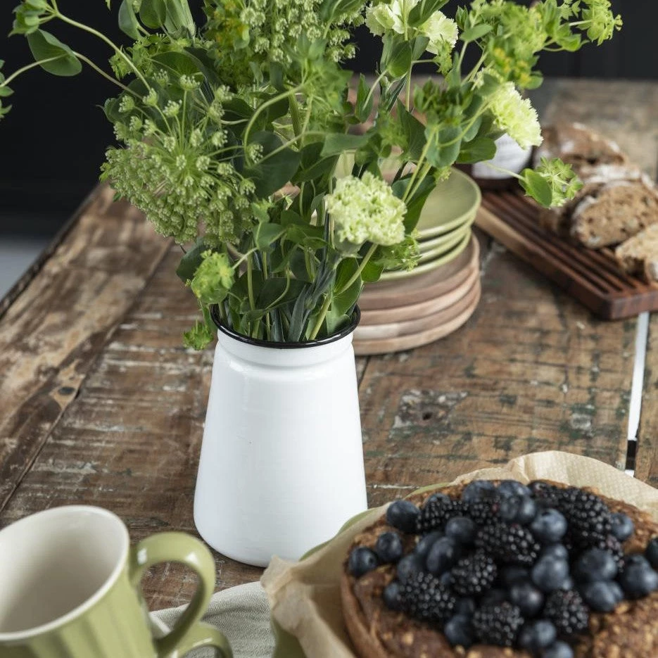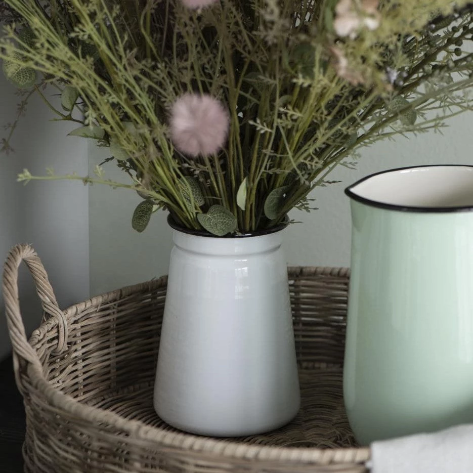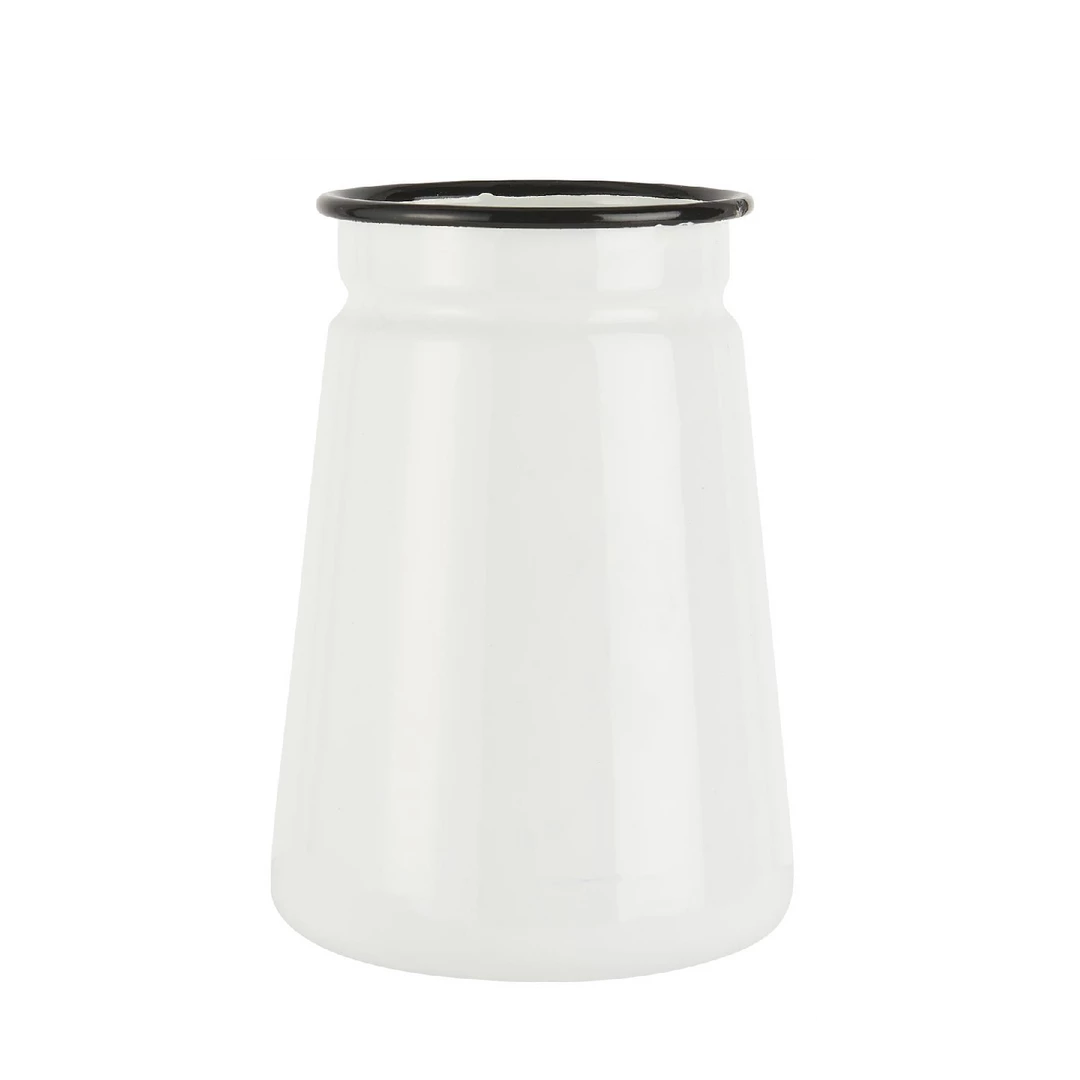 White enamel vase with black rim. This vintage style vase is beautifully simple in its style.