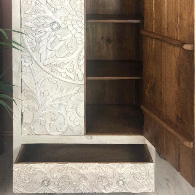 Hand-carved Mango Wood Indian Armoire. This stunning cupboard has carved doors, using a very special technique of hand carving that comes from the Jaipur area of India. The doors open to reveal three storage shelves and there is a drawer below.