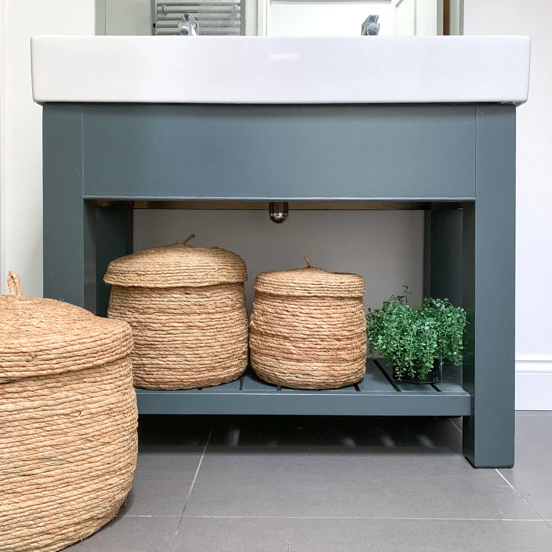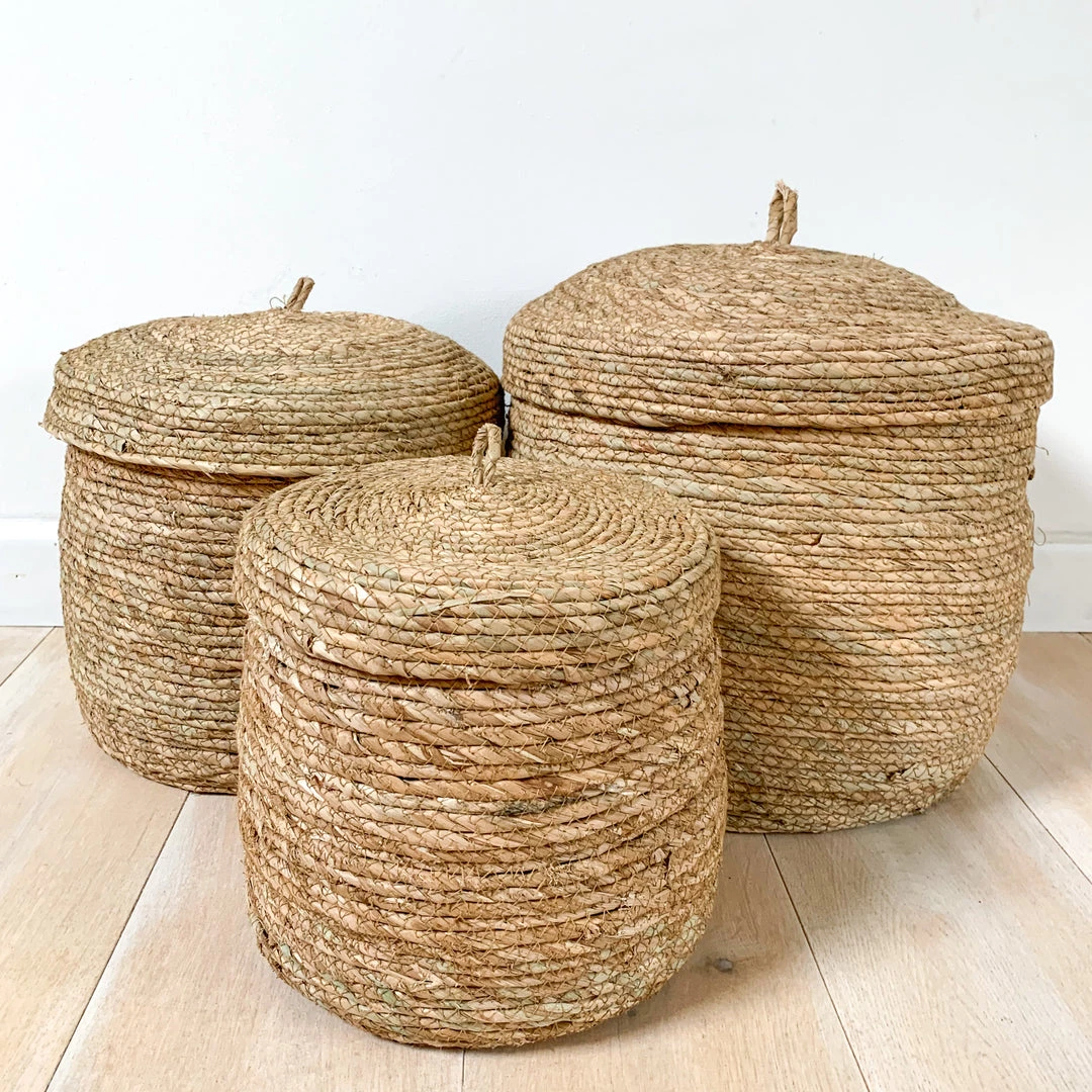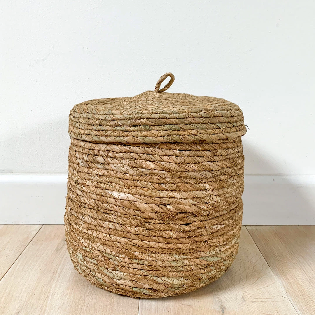 Small, light brown woven basket with lid. A beautiful storage solution for any household items. The natural texture of baskets adds warmth and rustic charm to a room scheme.Â