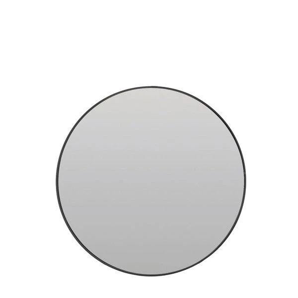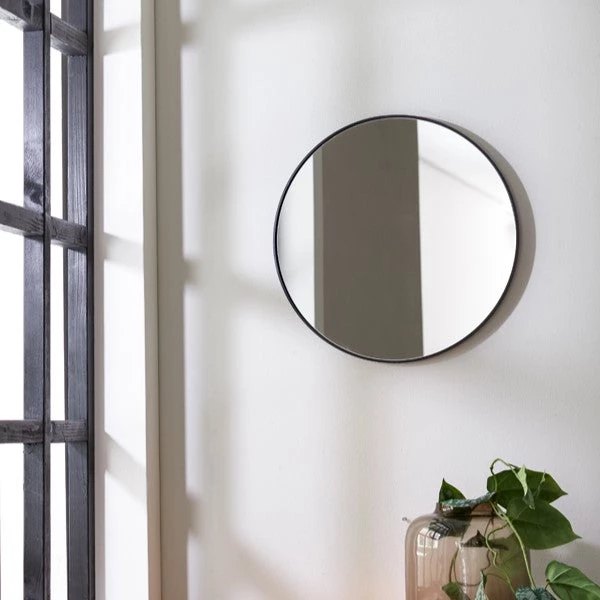 Round Black Metal Framed Mirror 50cm. This clean, stylish, round mirror is perfect for a hallway, cloakroom or bathroom. Comes with integral brackets for ease of hanging.