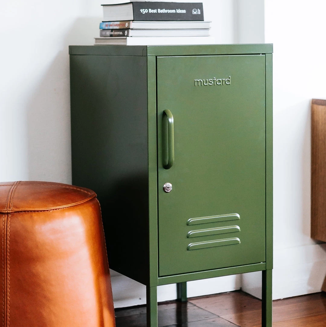‘The Shorty’ locker in olive green. Cool, contemporary and so versatile, The Shorty Locker makes itself at home tucked neatly next to your desk, snuggled up next to your sofa or sitting beside your bed.