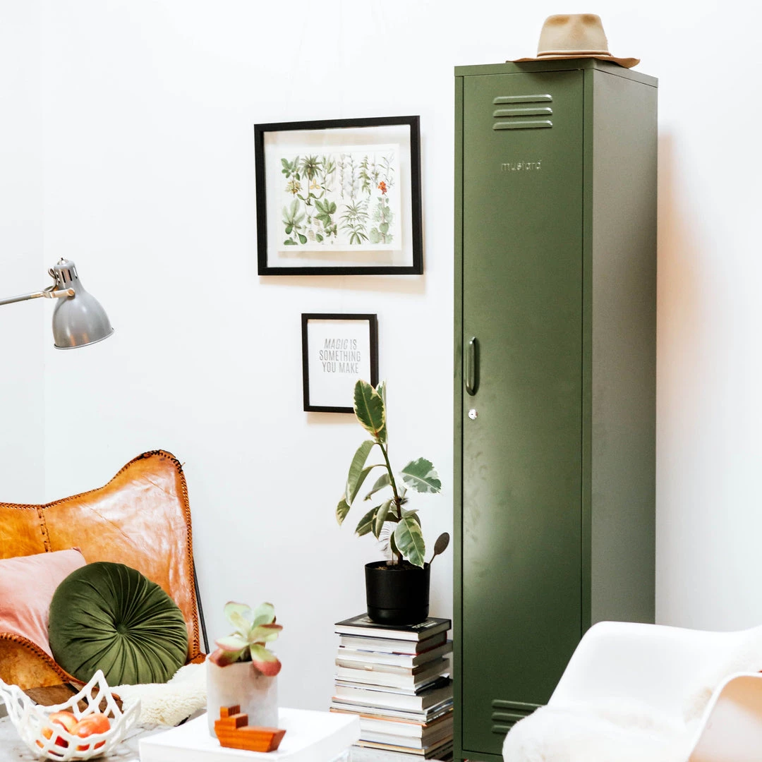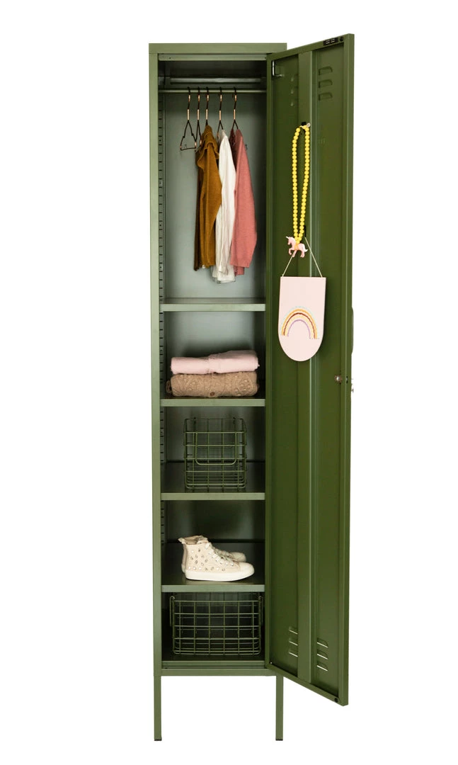 ‘The Skinny’ locker in olive green. Cool, contemporary and so versatile, The Skinny Locker wants to help. She’ll keep your stuff neat and tidy. Standing alone or in paired with friends The Skinny is elegant, beautiful and practical.