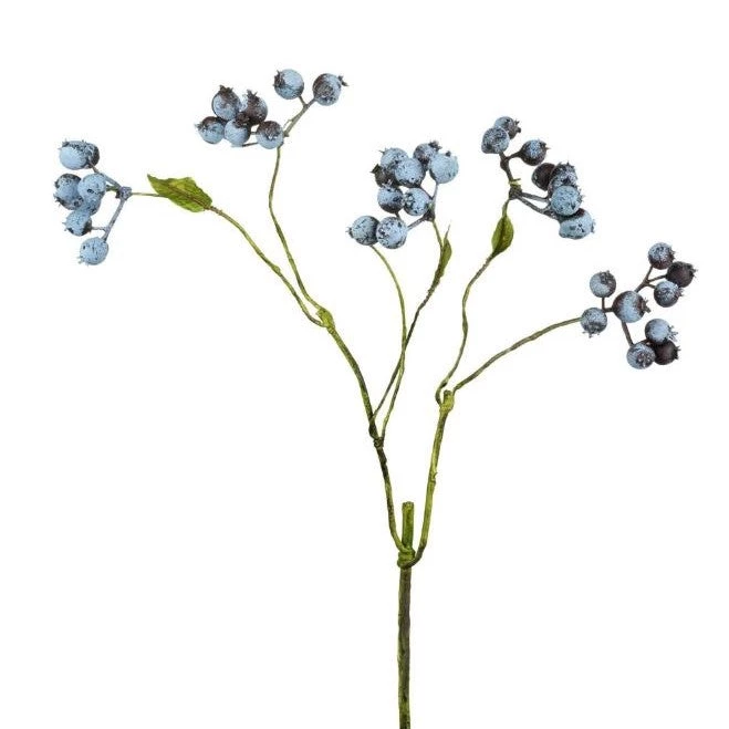 Faux blueberry spray. This artificial blueberry stem looks gorgeous alone or paired with real or faux greenery. TheĀ berries haveĀ an authentic dusty blue colour, adding interest and height to a display.