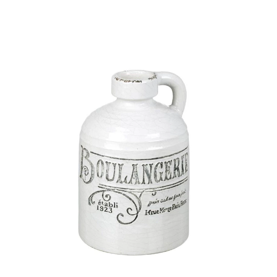 Vintage style, white ceramic, crackle glaze bottle with Boulangerie print. This bottle can be displayed alone or with flowers and will add French charm to a kitchen or bathroom.
