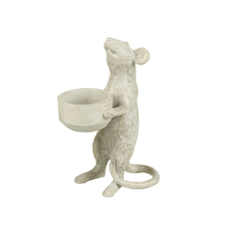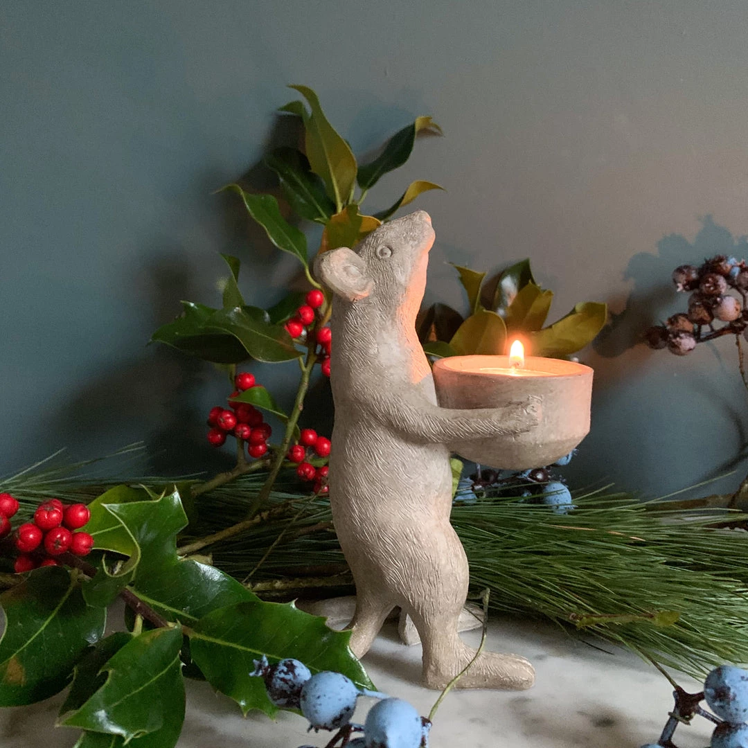 Stargazing Mouse Tealight holder. Charming and playful, these mice are a delightful addition to the home, bringing a bit of fun. Use for tealights or as a holder for jewellery and cufflinks. Crafted from polyresin in a grey, cement effect colour.