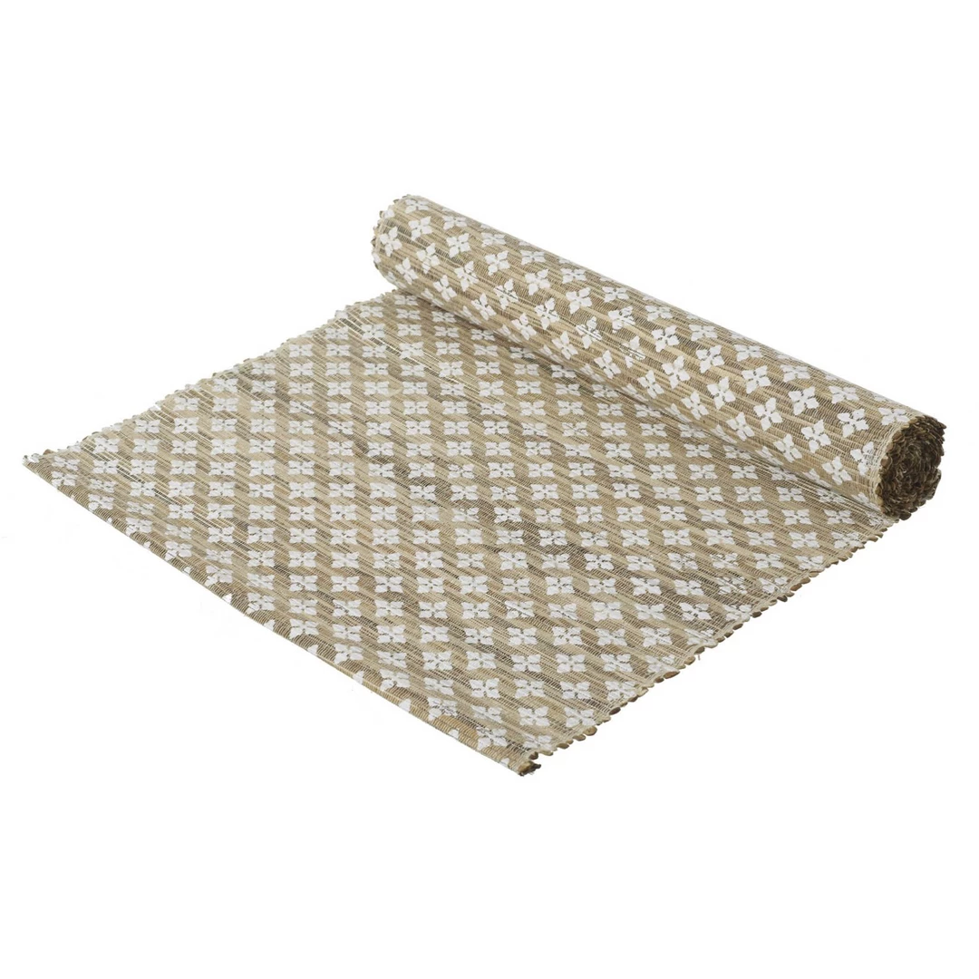 Woven Table Runner with Diamond Design. Crafted from water hyacinth with a white printed diamond design, this table runner is a lovely addition to a natural Tablescape. Perfect for conservatories or outdoor entertaining with its rustic vibe.