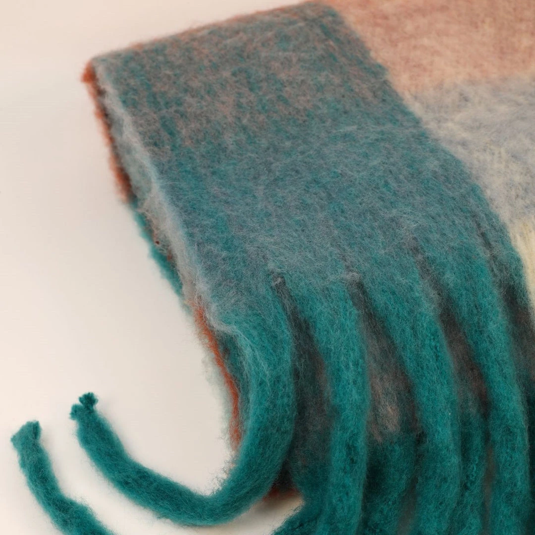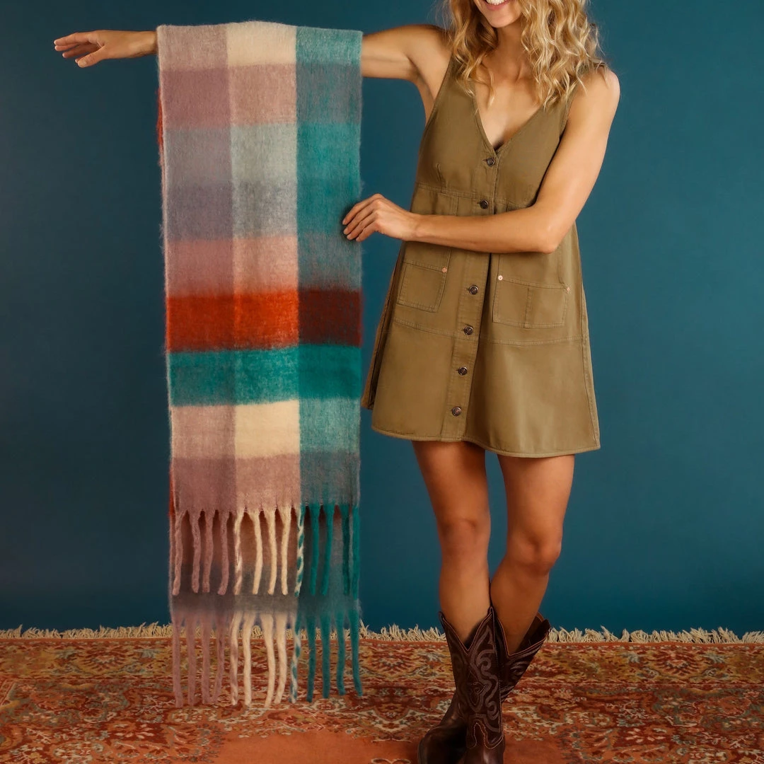 Chunky Tassel Scarf in Teal and Damson Checks. Super soft, long, woven scarf in shades of Teal, Damson and Rust with long, squishy tassels. This is a great statement scarf that will keep you snug and warm this winter. It’s also long enough to use as a cosy bed runner when you are not wearing it. Comes with complimentary Gift Bag.