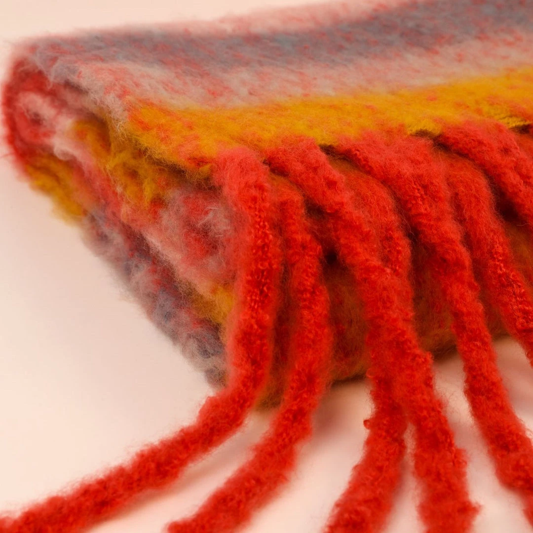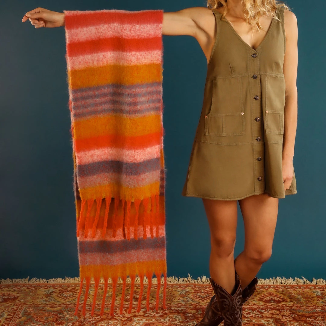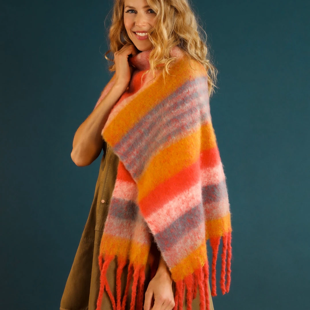 Chunky Tassel Scarf in Sunset Stripe.Ā Super soft, long, woven scarf in sunset shades of tangerine andĀ denim with long, squishy tassels. This is a great statement scarf that will keep you snug and warm this winter. Itās also long enough to use as a cosy bed runner when you are not wearing it.Ā Comes with complimentary Gift Bag.